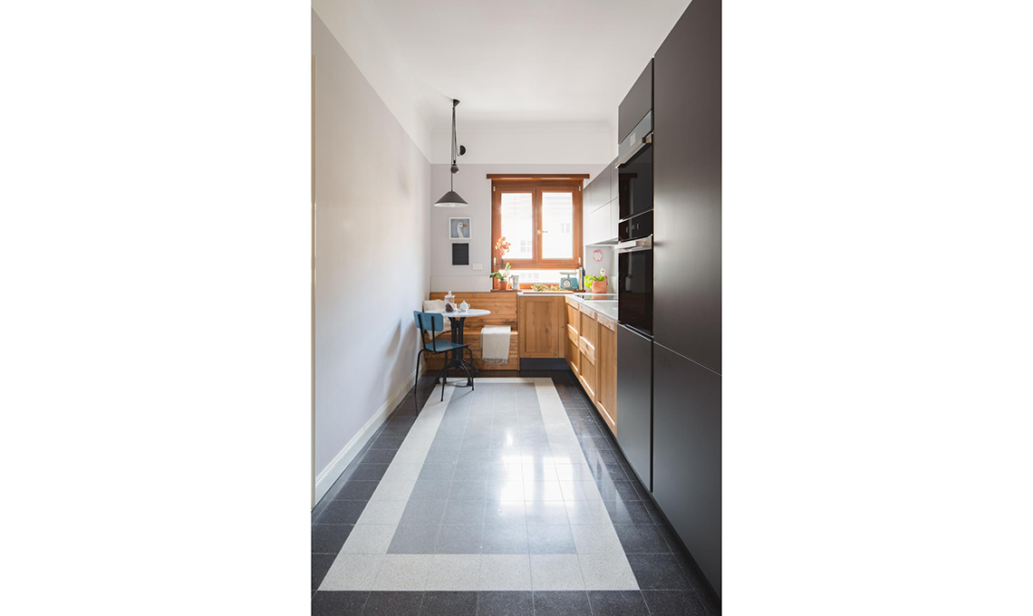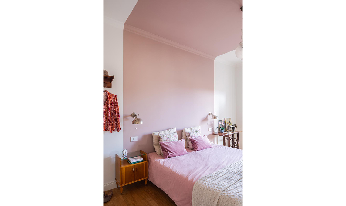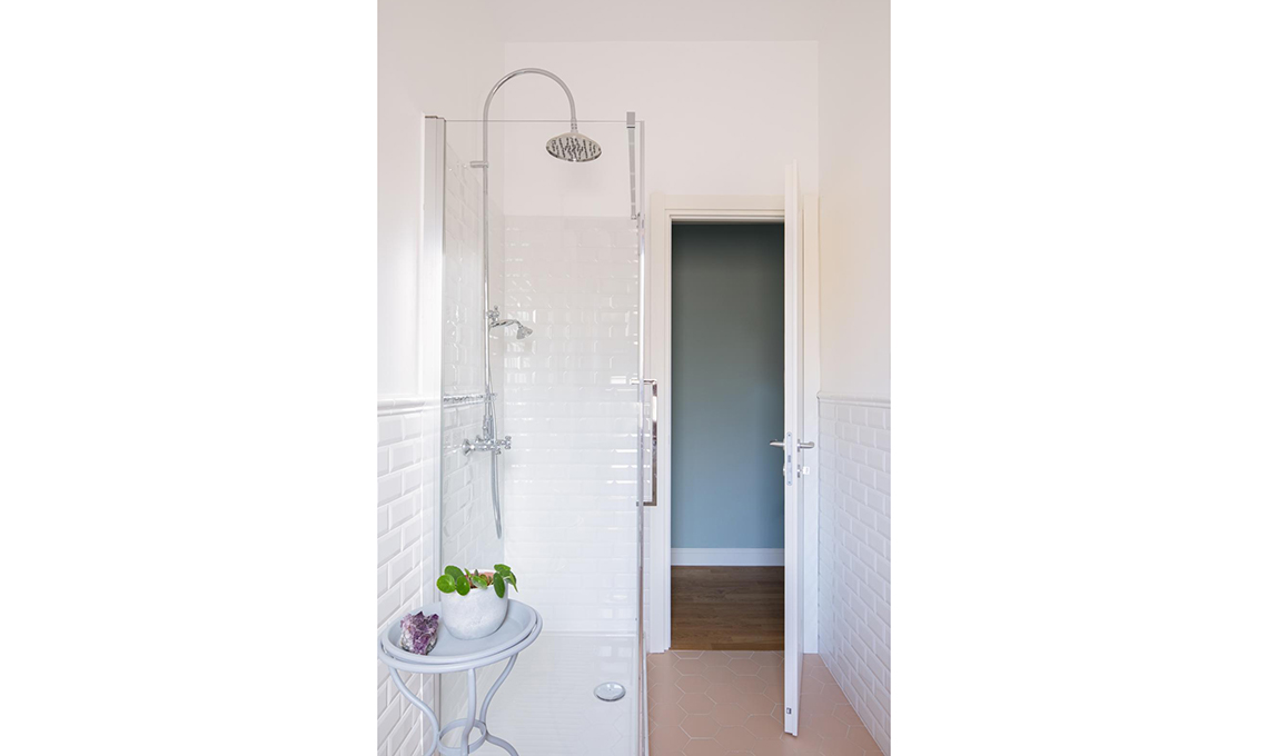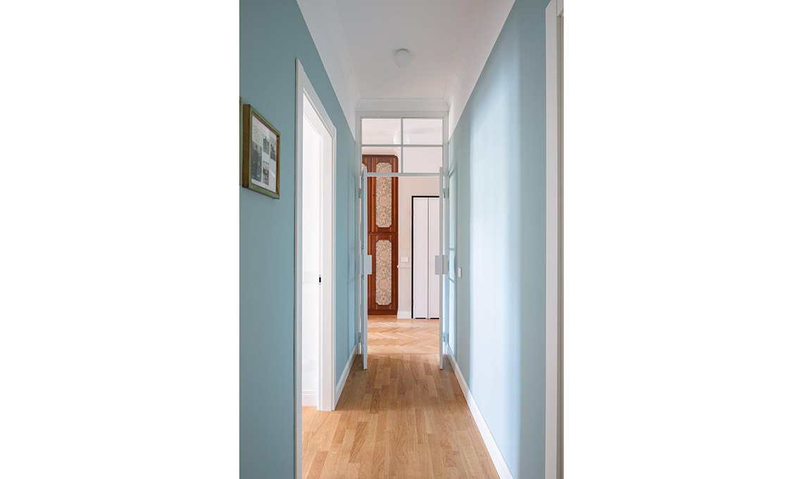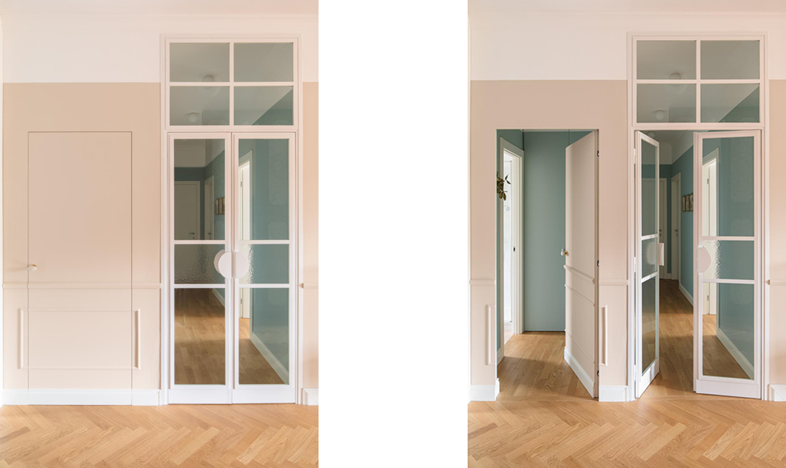 I pavimenti che richiamano quelli originali, insieme agli infissi su misura vetrati che fanno passare la luce e alla palette di colori pastello, hanno dato vita al guscio ideale per accogliere i pezzi di famiglia, valorizzati come Manuela desiderava da tempo.