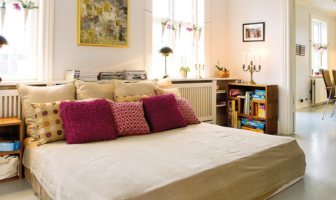 Il sommier è in posizione strategica, tra salotto e cucina, attrazione fatale per il relax davanti alla tv. Vorresti anche tu un eco-corredo made in Italy? Lenzuola, cuscini, copripiumini 100% lino bio in toni naturali (Zenoni&Colombi, anche online).