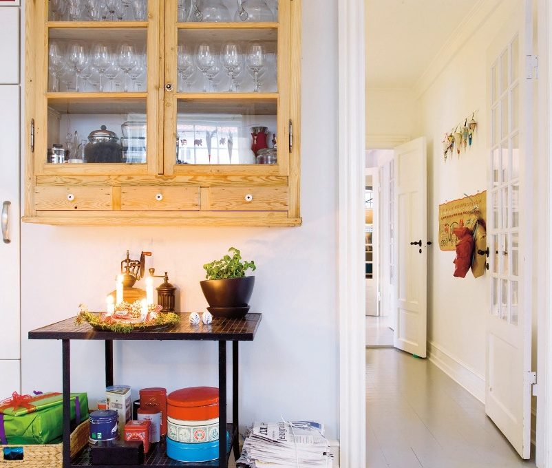 Nel punto di passaggio, la credenza completa sarebbe stata ingombrante. Così Heidi ha appeso ben in alto solo l’alzata, meno profonda della base. Con risultato multiplo: ha ottenuto un effetto originale e leggero, lo stile country compensa il rigore della cucina. E non ha rinunciato del tutto ad avere un contenitore capiente: ha a portata di mano i cassetti e il primo ripiano, mentre ha riposto su quelli superiori i calici e le brocche di cristallo che si usano meno.