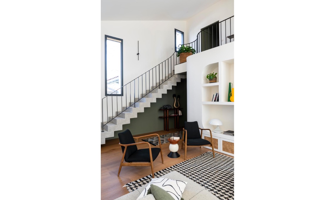 Oltre a un uso sapiente del colore, che nel tutto-neutro dà risalto ad alcune zone, l’importanza delle strutture: la mega tettoia all’esterno ma anche la scala, il soppalco, il camino, le nicchie all’interno. Che personalità!