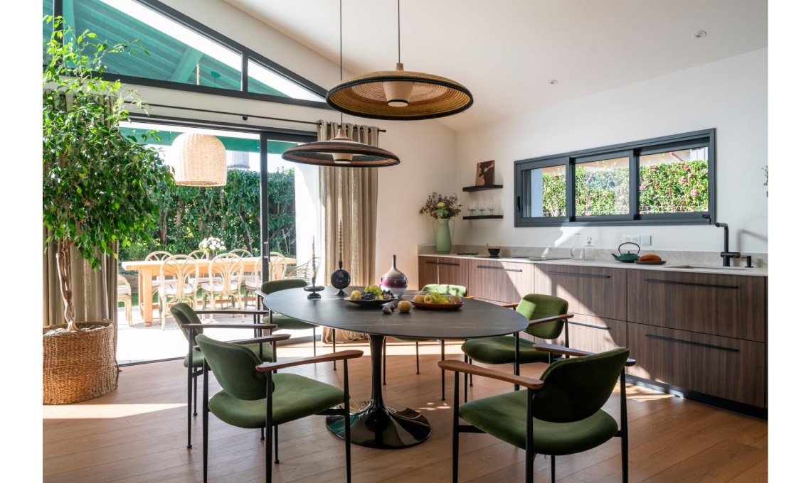 farlo’. @juliechatelain_interiors. In questa foto il grande living che ospita anche la cucina, con le vetrate che incorniciano la zona outdoor.