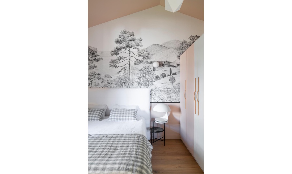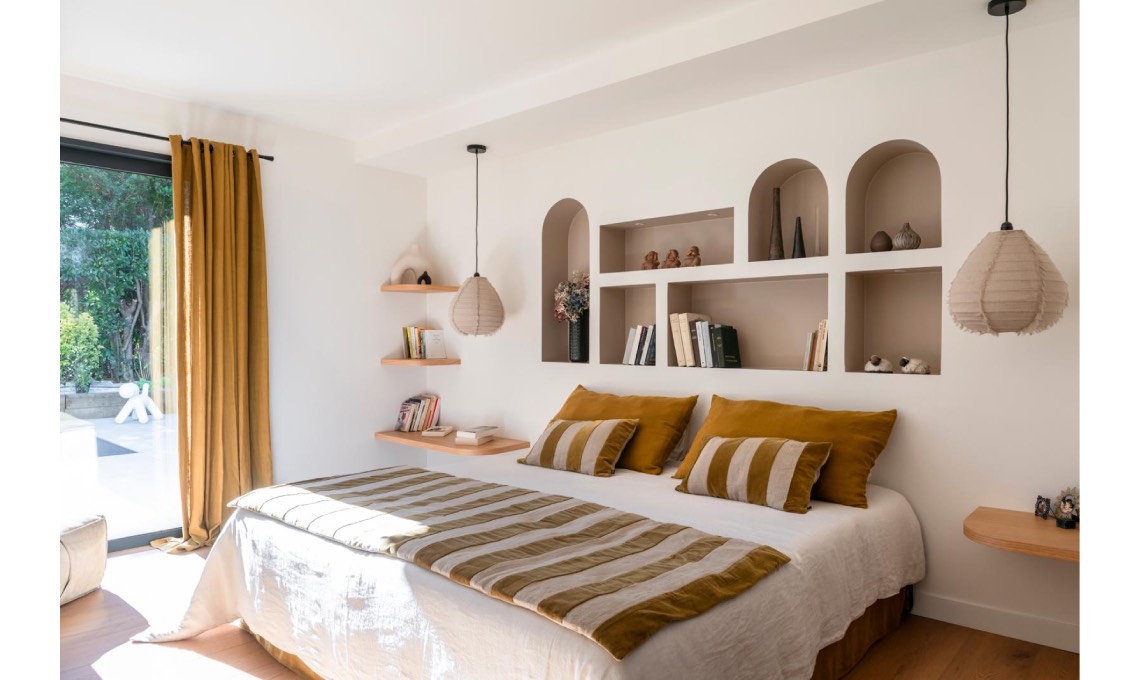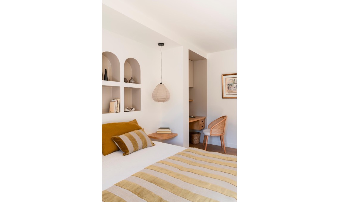 al letto. Nelle nicchie, vasi [H&M Home] e [Habitat]. Sedia [AMPM],