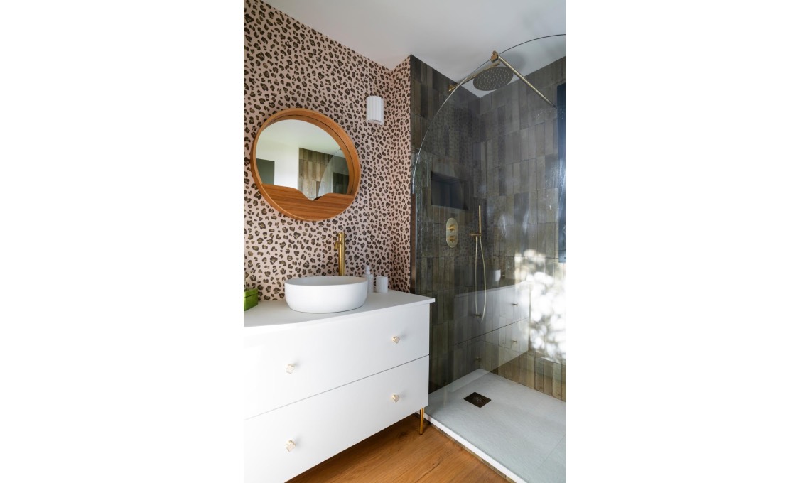 da parati effetto maculato e le zellige scure nella zona della doccia. Wallpaper Graou - Kaki [Bilboquet], zellige