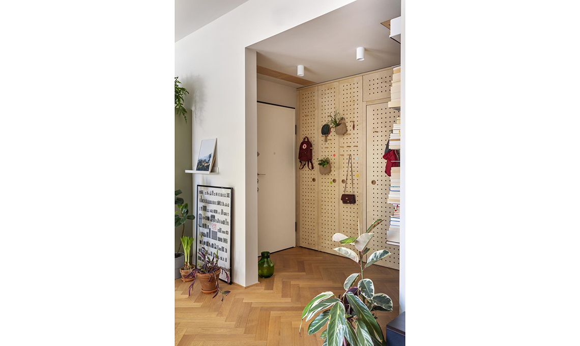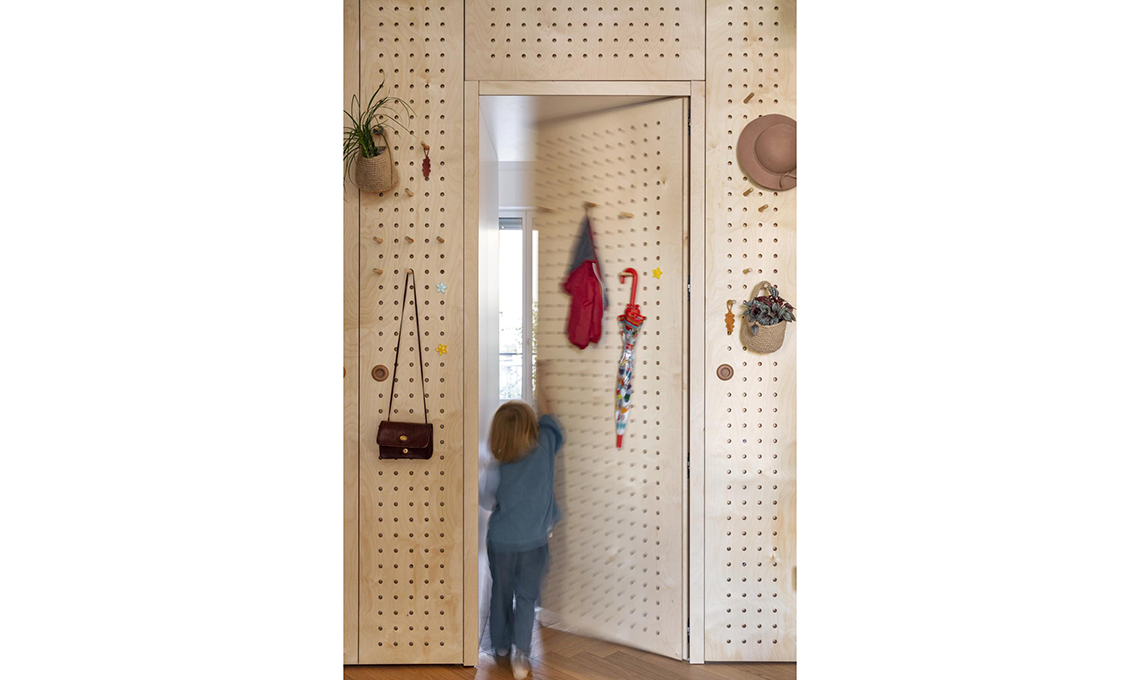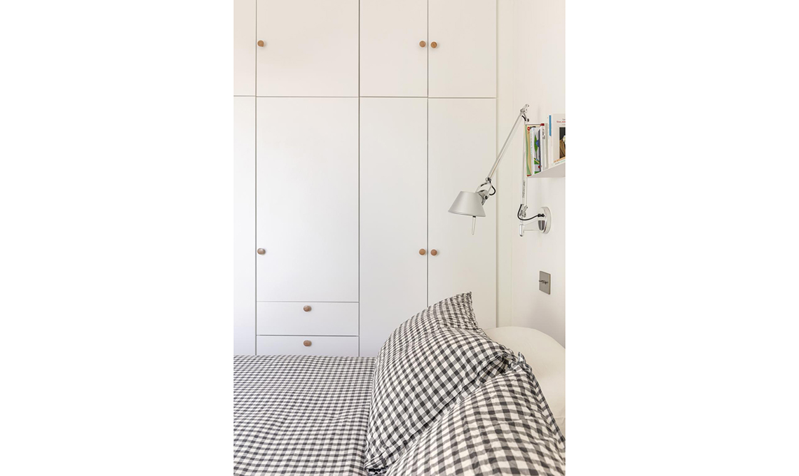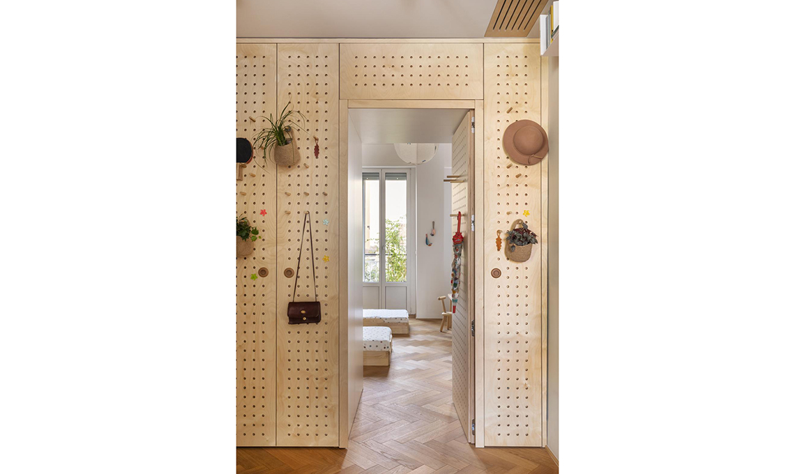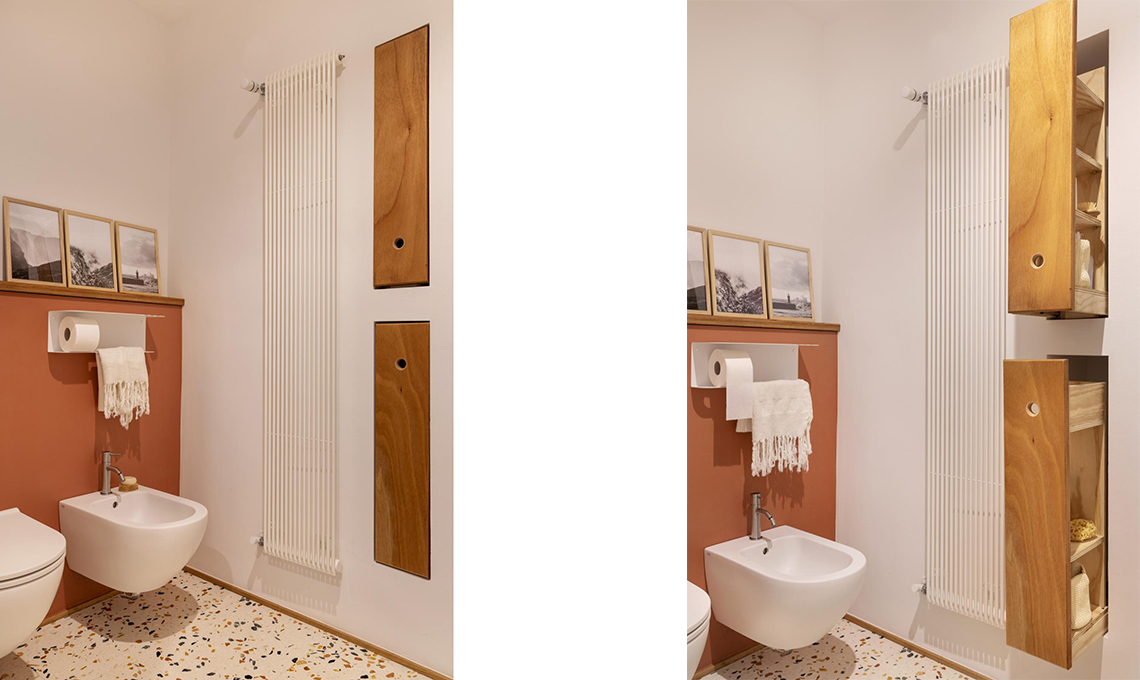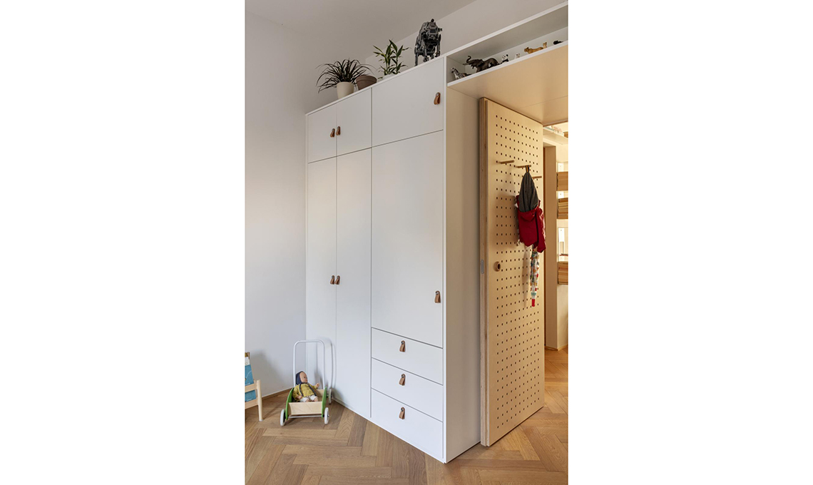 La cameretta ha preso il posto di cucina e bagno e quest’ultimo ora è vicino alla stanza padronale. Ma sono i contenitori a fare la differenza: l’armadiatura pegboard all’ingresso per tenere tutto in ordine, i guardaroba vedo-non vedo nelle camere e i cassetti che ‘spariscono’ nel muro in bagno.