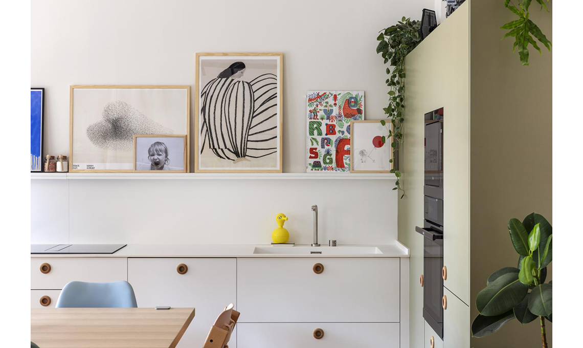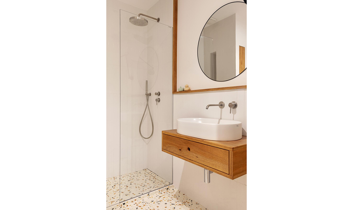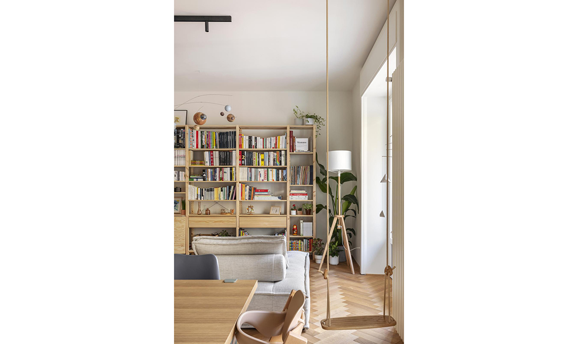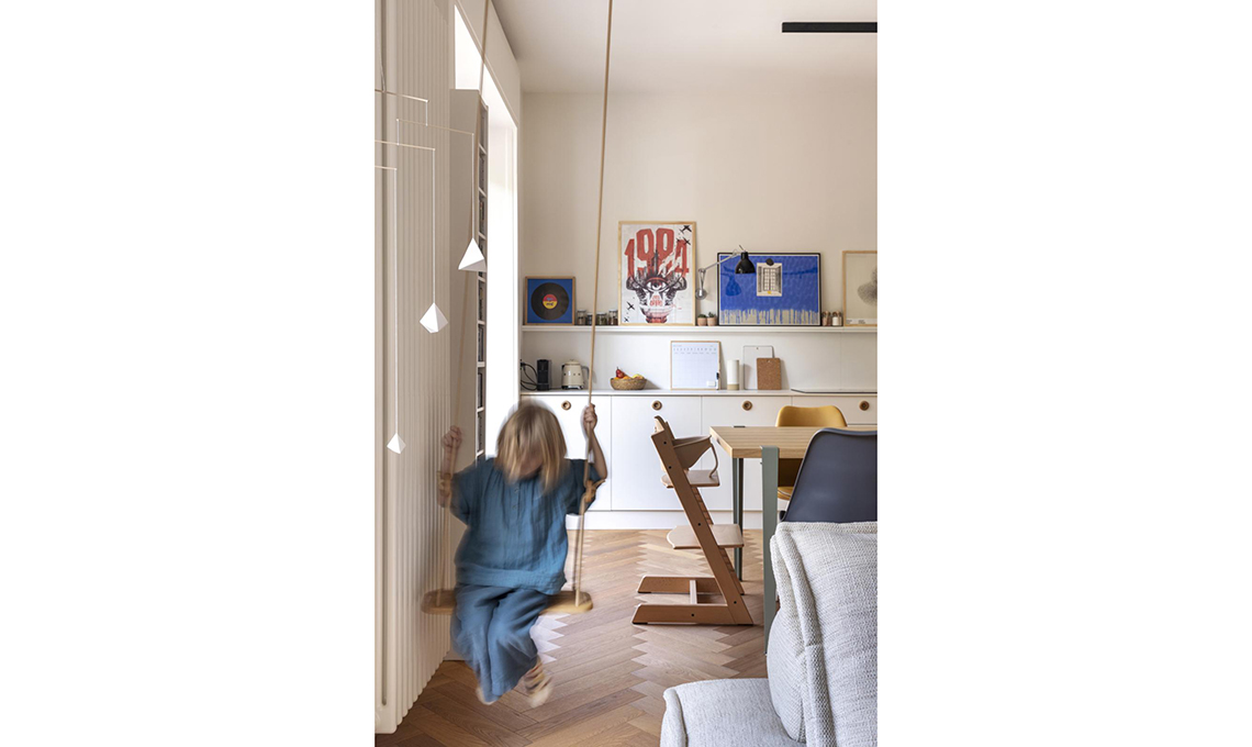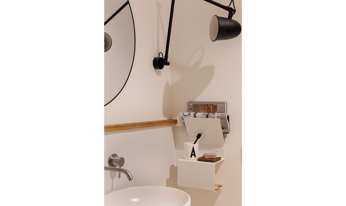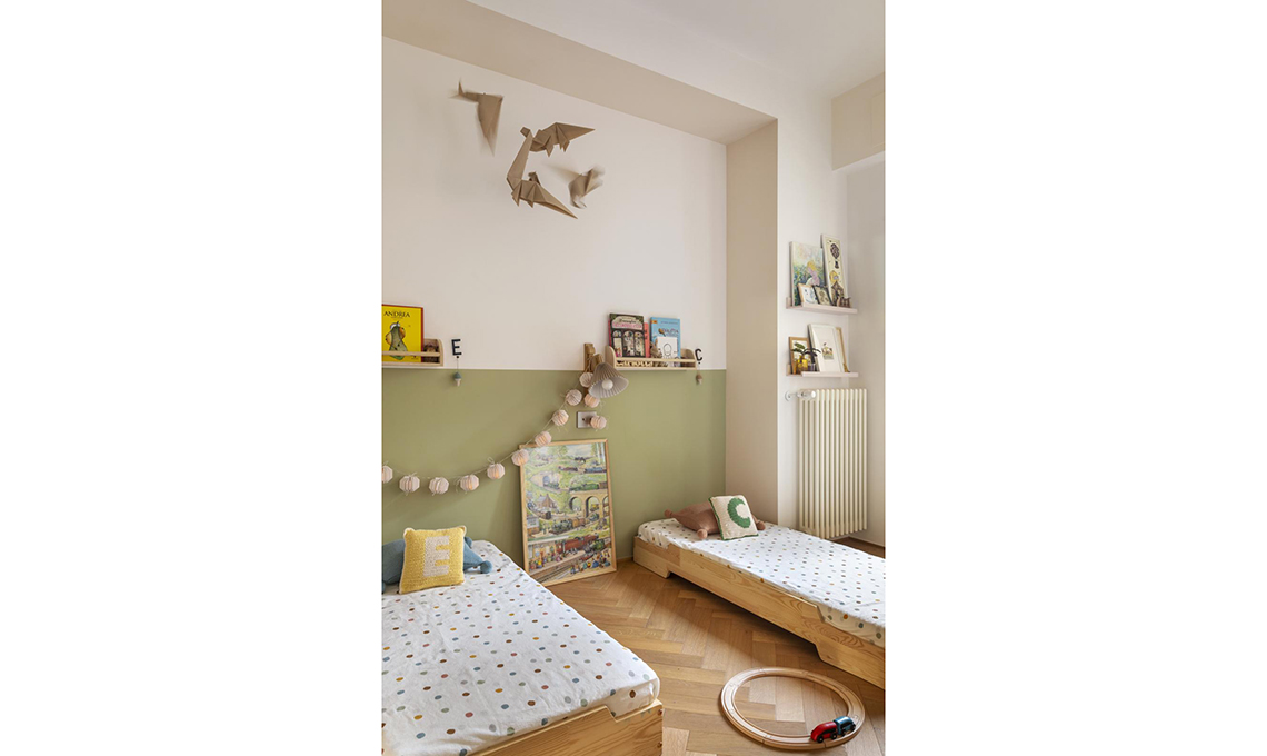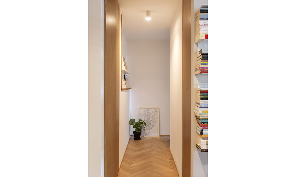 La cameretta ha preso il posto di cucina e bagno e quest’ultimo ora è vicino alla stanza padronale. Ma sono i contenitori a fare la differenza: l’armadiatura pegboard all’ingresso per tenere tutto in ordine, i guardaroba vedo-non vedo nelle camere e i cassetti che ‘spariscono’ nel muro in bagno.