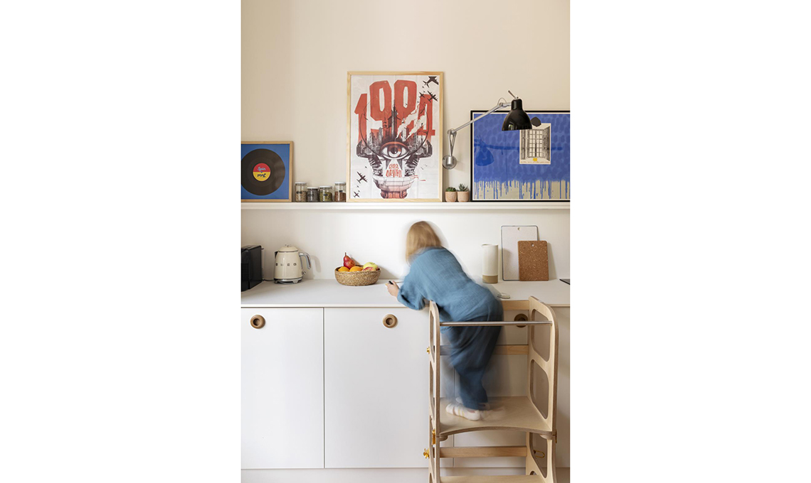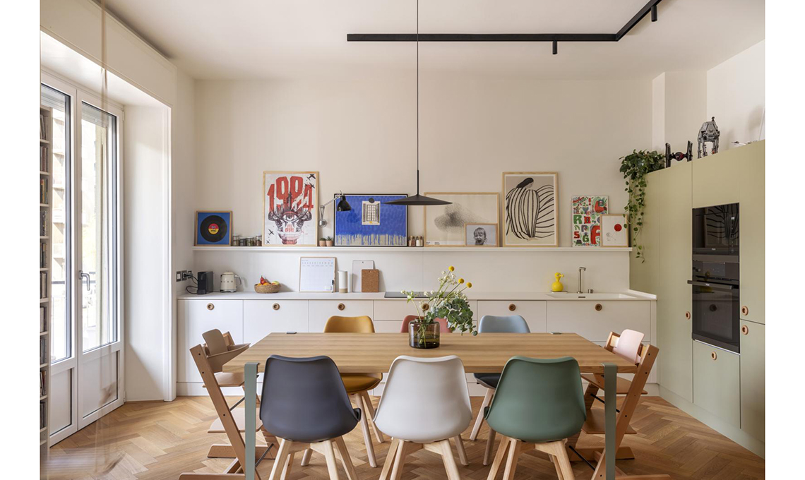 Il soggiorno doppio l’ha convinta subito. «Ne volevo uno da vivere tutto il giorno in famiglia e questo è davvero perfetto per dimensioni, luce e aria» racconta Rossella. Così ne ha fatto un locale multiuso: salotto, cucina (che si nota poco) e pranzo ma anche laboratorio, grazie al grande tavolo fai-da-te.