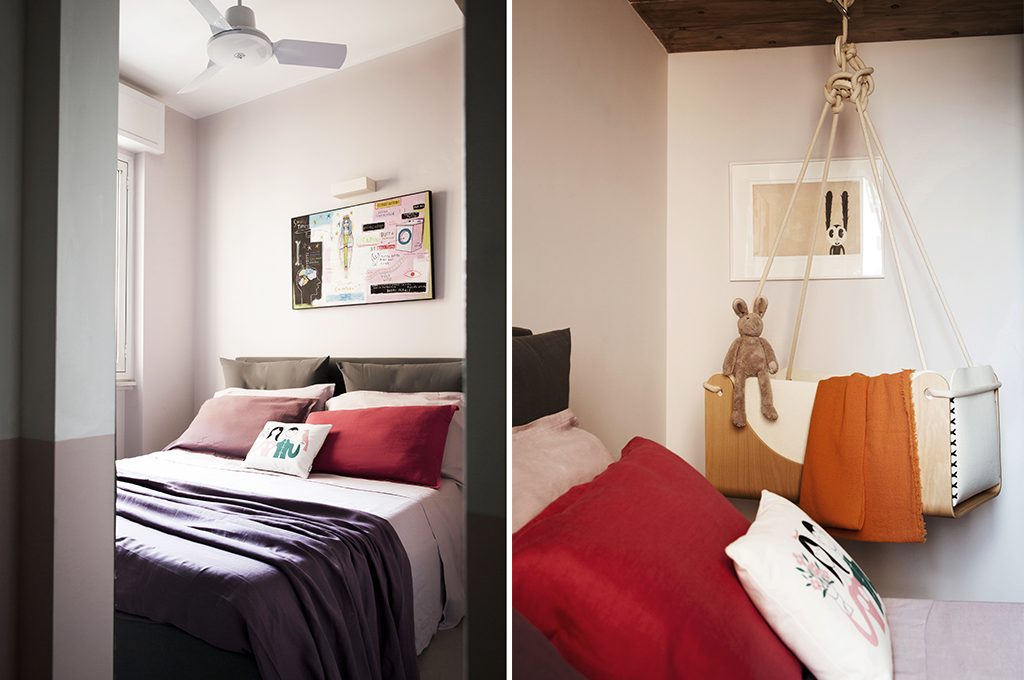 La piccola camera da letto. Per il piccolo Giosuè si è pensato a una culla ‘leggera‘ da appendere al soppalco. Lenzuola [Fazzini], sgabello [Miniforms], lampada [Flos], culla [Woodly], plaid [Society], pupazzo [Zara Home], quadro [Spider].