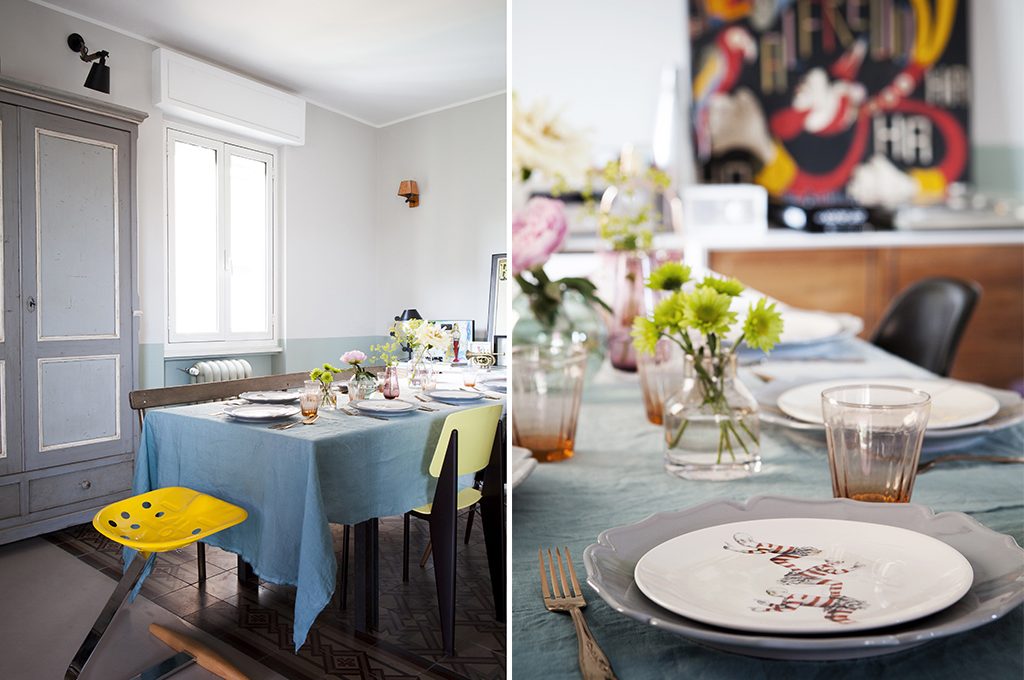 Sulla tavola, i piattini Circo [Laboratorio Paravicini] raccontano lo spirito giocoso di questa casa. Bicchieri Firenze, piatti Glamour e posate Retrò, tutto di [Bitossi Home].