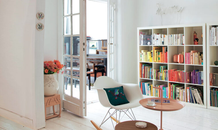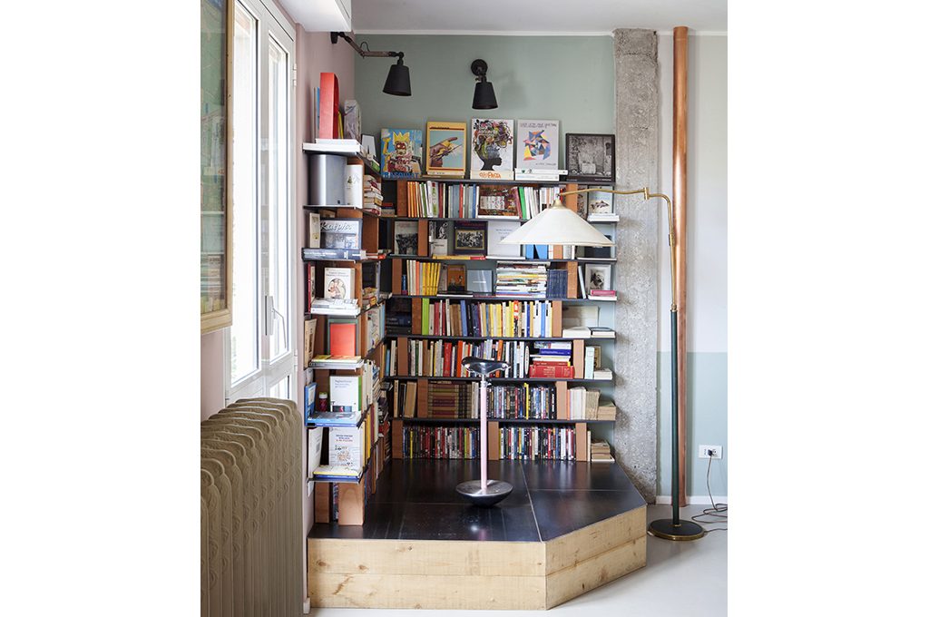 La libreria è un fai-da-te, realizzata con mattoni da cantiere e mensole di ferro. Il palco su cui amano esibirsi i proprietari, invece, nasconde una ‘botola‘: lo spazio sottostante funge da archivio! Sgabello Sella [Zanotta €706].