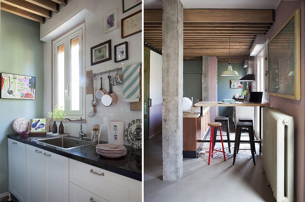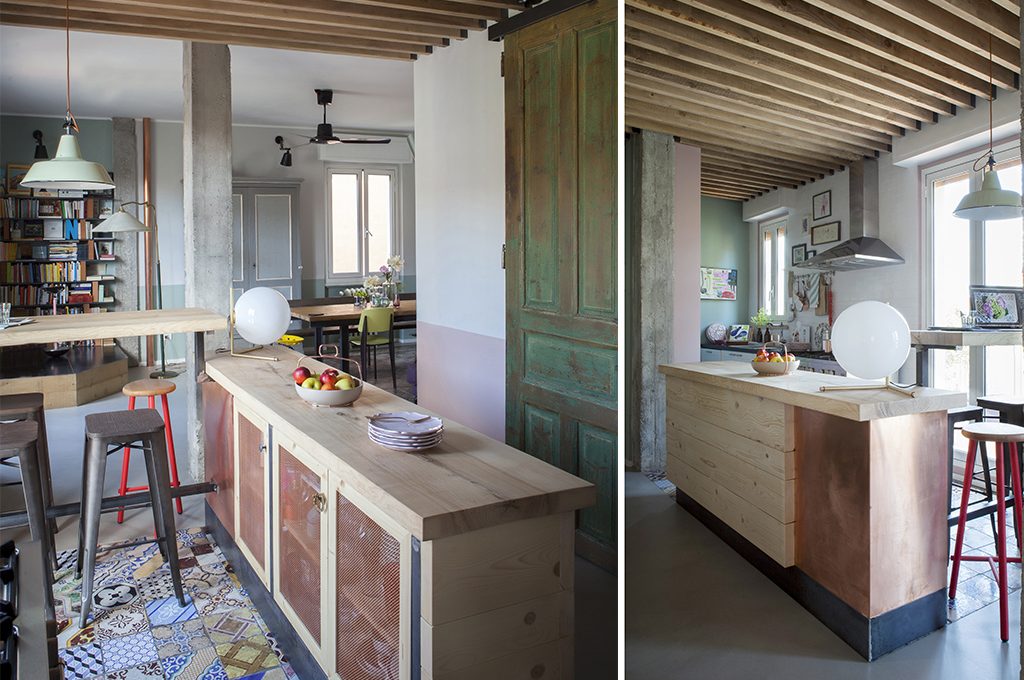 Uno dei leitmotiv della zona giorno sono le assi da ponteggio: ‘costruiscono‘ il tavolo, il bancone della cucina e il soffitto. In quest‘ultimo, sono stati inseriti 40 faretti nascosti tra gli spazi, alcuni per un‘illuminazione diffusa, altri per assicurare scenografici giochi di luce durante gli spettacolini. Nota, infine, le colonne portanti: anziché essere una presenza ‘scomoda‘, lasciate in cemento grezzo contrastano la lucentezza del rame e diventano belle da guardare!