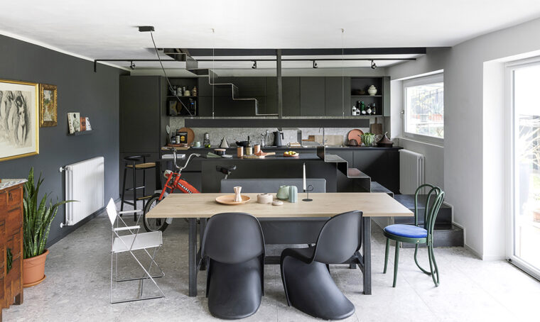 Luce Mr. Light [Nemo €598] e i quadri [Galleria L‘Affiche]; sedie, gialla Standard [€653] e nere DSW [€369], sono di Vitra. Sgabello Mezzadro [Zanotta €566]. L’armadio proviene dallo smantellamento di un vecchio hotel in Trentino.