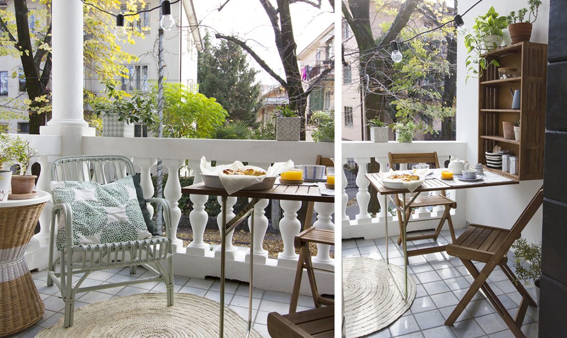 Qui ci sono tutti gli ingredienti per rilassarsi all’aperto! Poltrona in rattan recuperata e ridipinta, cuscino [Ikea], tappeto in foglie di palma [€66 su » it.smallable.com]. Filo di lampadine [Ikea €39,99]. Il tavolo da muro ribaltabile è stato un acquisto intelligente: da tenere aperto quando serve, si chiude facilmente per avere più spazio. Ne trovi di simili su eBay.