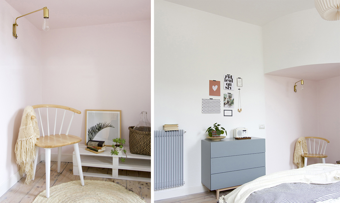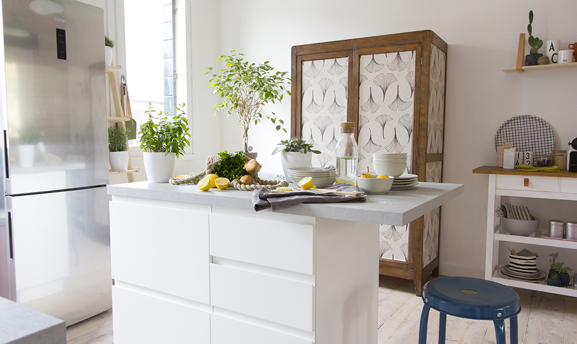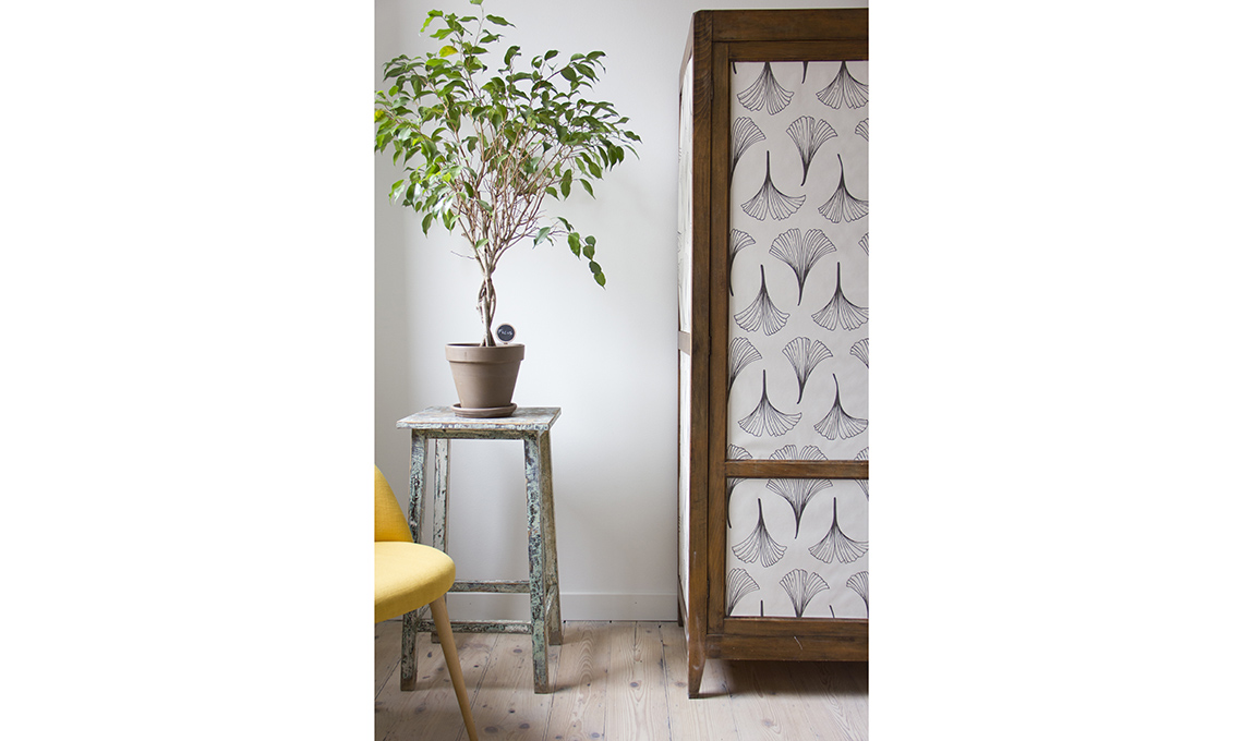 L’armadio era nella cameretta di Camilla, quand’era piccola: «Conteneva i miei vestiti, e non volevo buttarlo, ma era decorato con colori non adatti alla casa» dice. La carta da parati [Murals Wallpaper] con foglie di Ginkgo Biloba gli ha dato un aspetto nordico. Il fai-da-te è semplice: ritaglia la carta su misura delle specchiature del mobile, applica sul retro la colla vinilica con il pennello e stendi la carta passando un panno morbido per non far formare bolle d’aria.