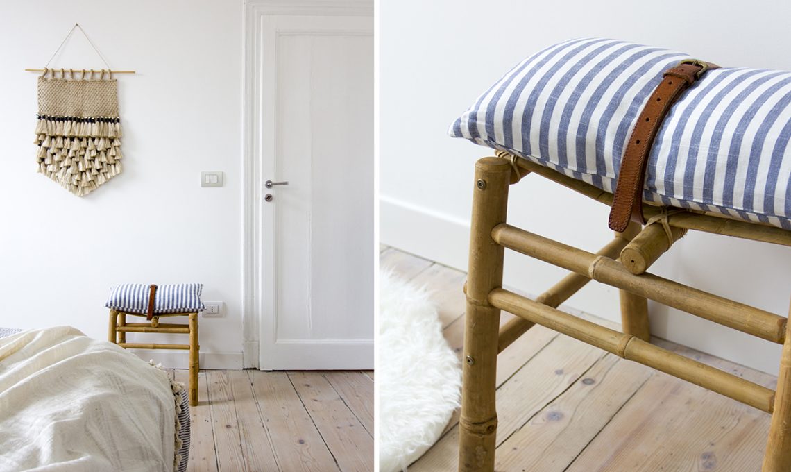 Il pavimento in larice degli Anni ’20 era coperto da un mordente scuro e semilucido, ma io l’ho subito immaginato così: chiaro e ‘raw’, in sintonia con la mia mania scandinava. Levigato e sbiancato con vernice ad acqua, è diventato la base perfetta su cui esercitare il mio stile. Il secondo step è stato creare un ambiente fluido tra entrata, soggiorno e cucina aprendo due varchi: l’ingresso, prima sproporzionato, ora è funzionale al living. Infine, la coesione stilistica: atmosfere boho-chic ed essenzialità nordica, arredi low budget e pezzi vintage usati con fantasia (la madia in ingresso, presa in un mercatino, funge da scarpiera!). E tanto fai-da-te.