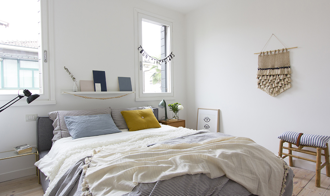 Fresca, essenziale e intima: così volevo fosse la nostra camera da letto. Originariamente qui era collocata la cucina, ma la distribuzione delle stanze non seguiva l’approccio contemporaneo dell’home design, che mette al centro la zona giorno favorendo la convivialità. Perciò ho portato la camera nella zona più raccolta della casa, senza perdere la bellissima luce che circonda tutto l’appartamento. Il tocco finale è stato aggiungere morbidezza, giocando con gli strati e diversificando le texture.