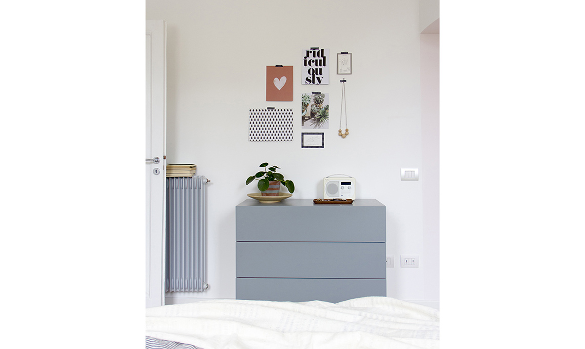 Camilla ama le sfumature del grigio-azzurro dall’effetto rilassante: l’ha trovata sul comò Artic [Maisons du Monde, cm 90x42x80h €169], l’ha usata per dipingere i radiatori.