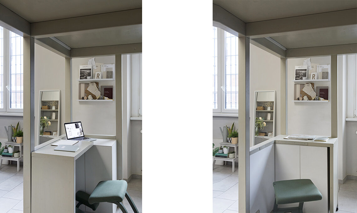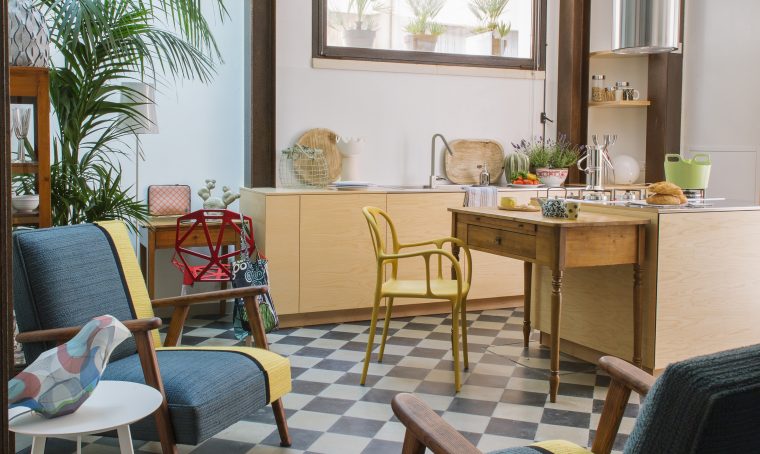 Il soppalco, dove è stata ricavata la zona notte, è il cuore di questo piccolo appartamento e ne disegna gli spazi. La zona giorno, piuttosto ampia per un monolocale, sceglie arredi trasformabili: il tavolo si allunga, lo scrittoio ruota, il divano diventa letto. La zona d’ingresso con bagno e lavanderia disimpegna l’open space; attorno al tavolo ‘gira’ la zona giorno.