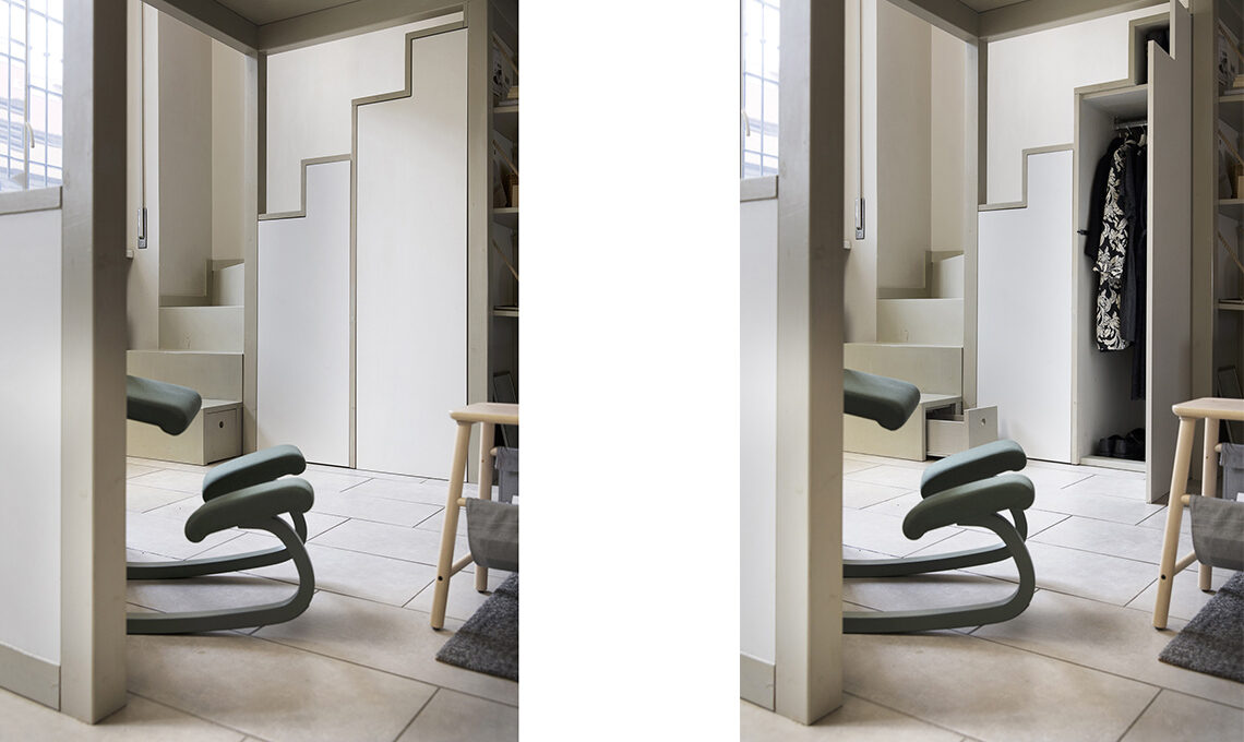 Sedia Variable™ serie Monochrome, qui nel colore Fern [Varier, cm 52x72x51h €419]. Ante e cassetti a scomparsa attrezzano la scala come ripostiglio e guardaroba.