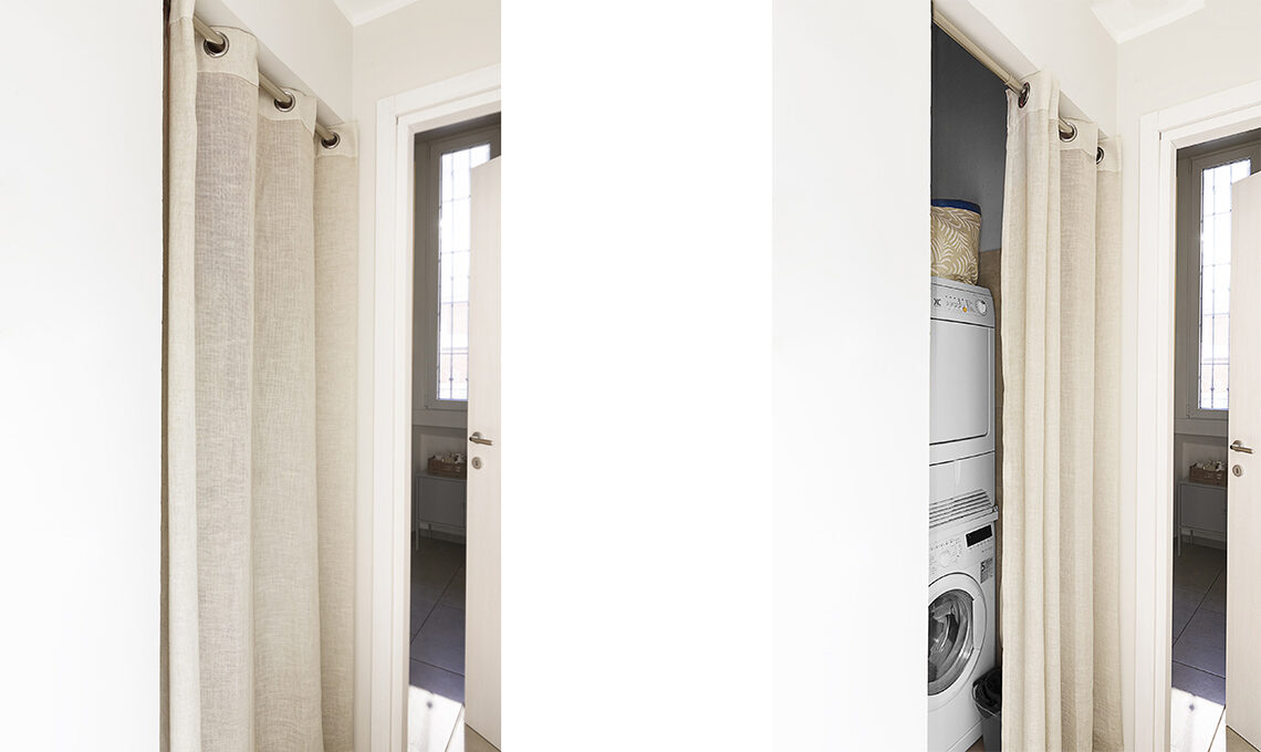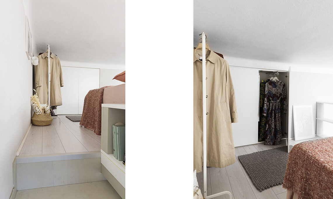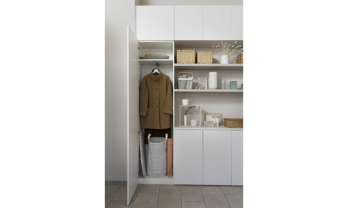 Nell’anta guardaroba le giacche, ma anche l’asse da stiro in versione small e il tappetino perlo yoga. Una struttura di profondità ridotta (come Pax di Ikea da cm 35) permette di recuperare spazio e appendere i capispalla come in foto.