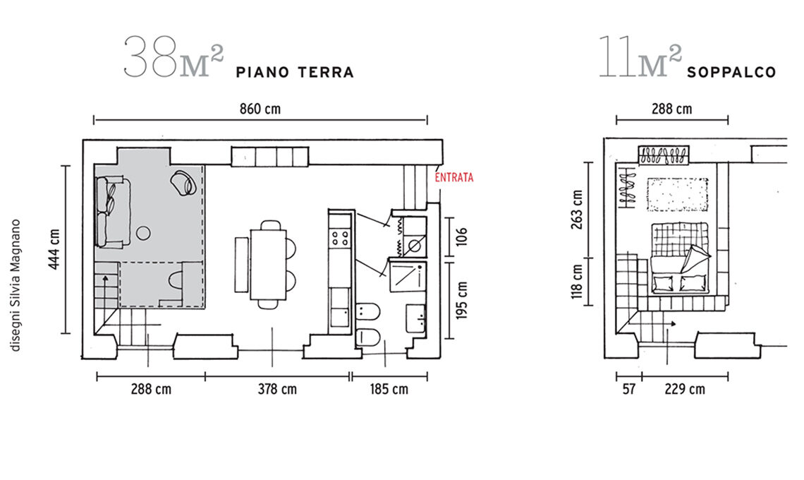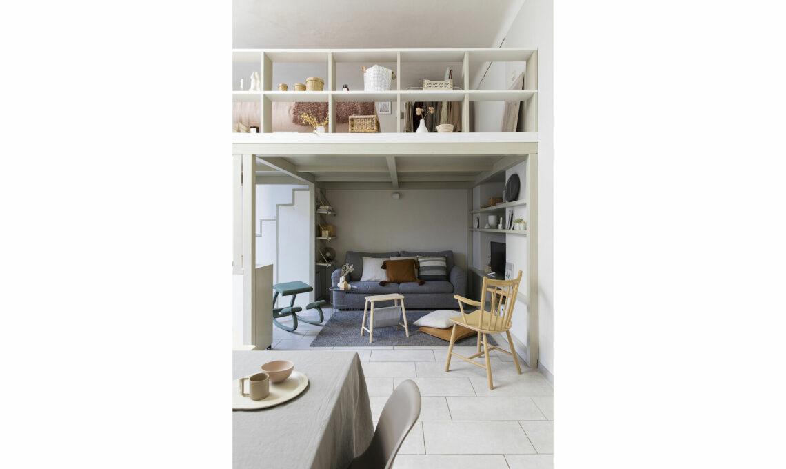 Doppio affaccio per la zona living, ricavata comeuna piccola alcova sotto il soppalco. Sopra, i moduli a giorno della libreria schermano la zona notte.