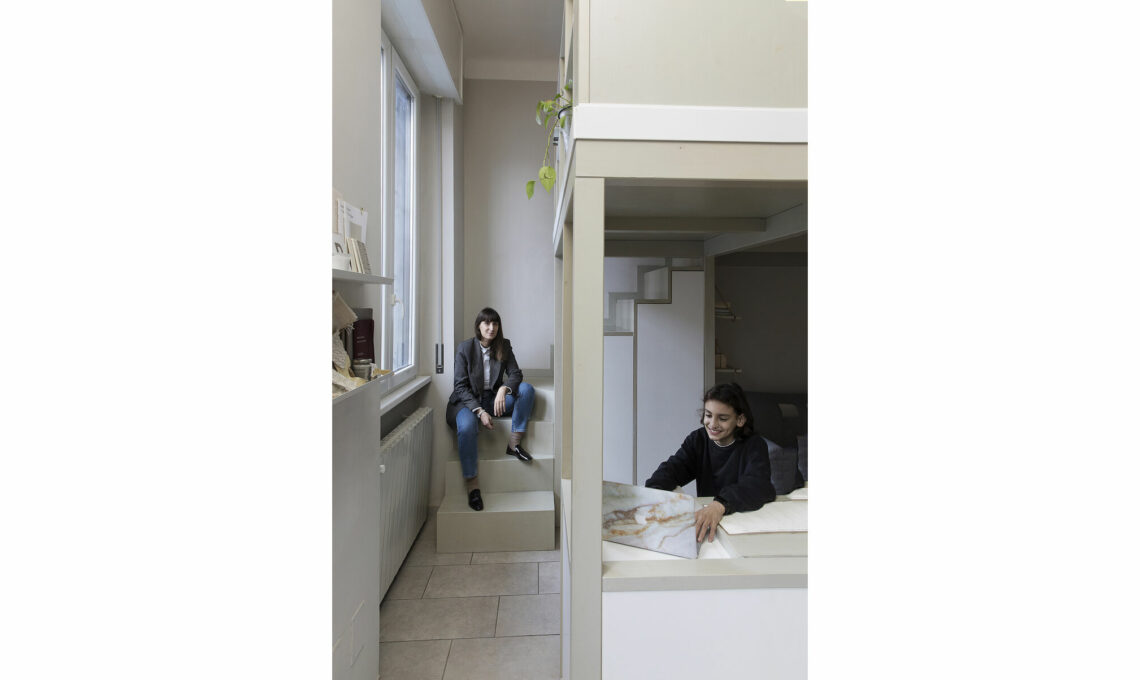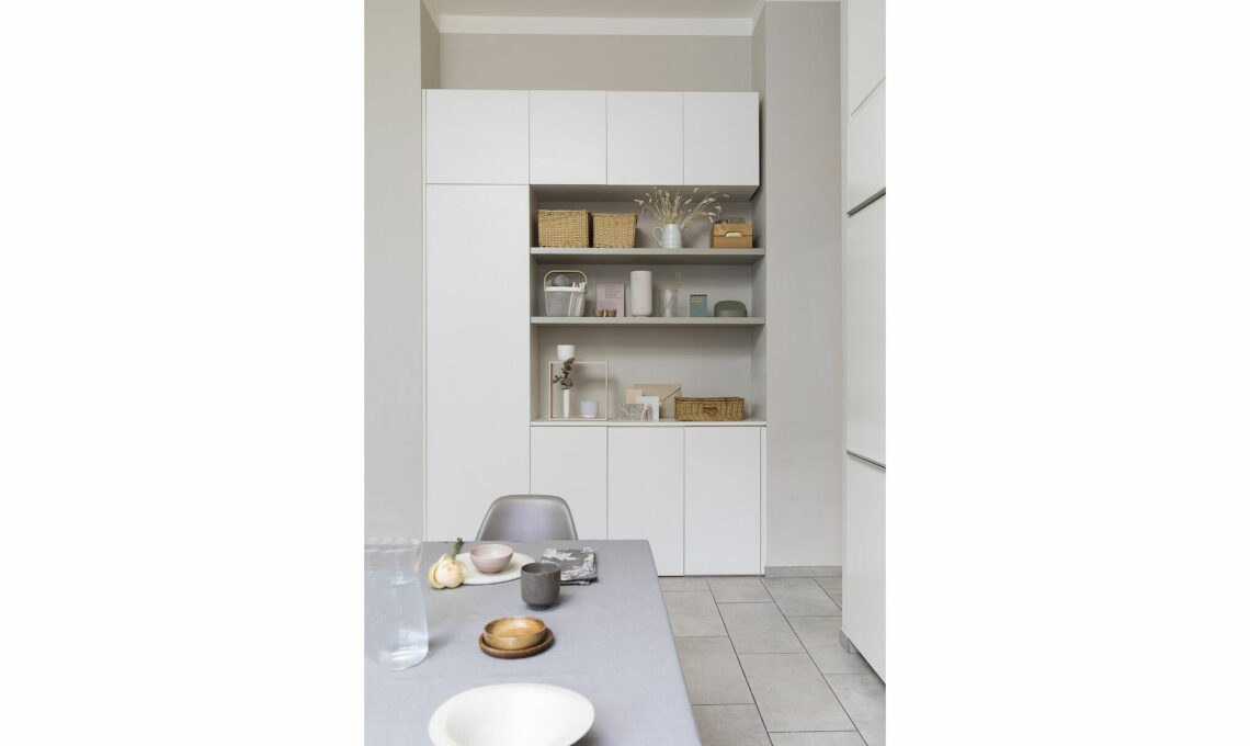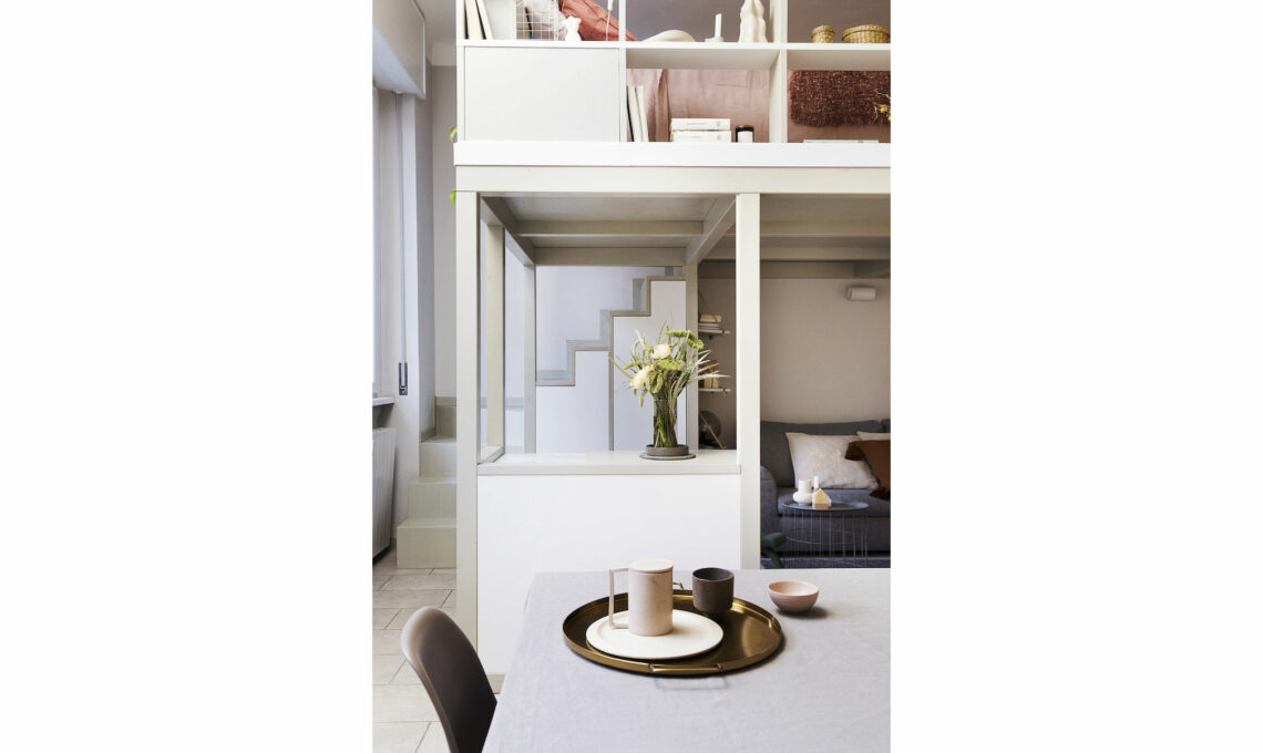 Minimalista ma con un segreto, la scala che sale al soppalco: l’affaccio sul living, con le ante effetto tetris, nasconde un ampio contenitore. Il binomio ghiaccio e bianco delle finiture crea giochi di luce e ombra.