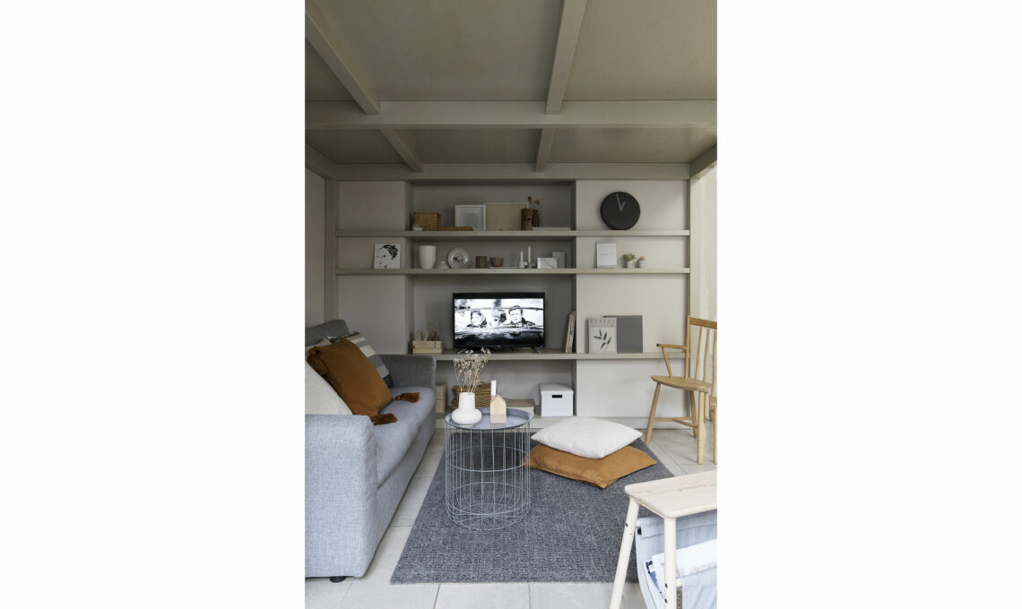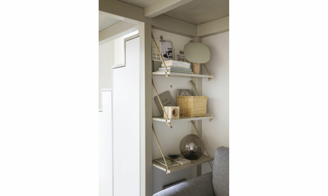 Estetica e funzionalità sono le parole chiave per organizzare uno spazio XS. La libreria a ribalta con i ripiani ancorati alle corde sfrutta lo spazio sottoscala. In mostra, oggetti belli e utili come lo specchio e la lampada di design e l’amplificatore per smartphone in legno.