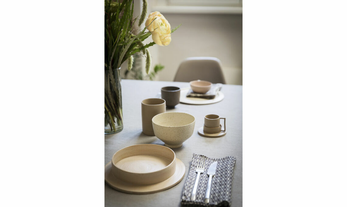 Tovaglia di lino fumo leggermente stropicciata e una sfilata di ceramiche nei toni naturali. Il tocco décor? I tovaglioli spaiati con un mix di stampe floreali e geometriche.