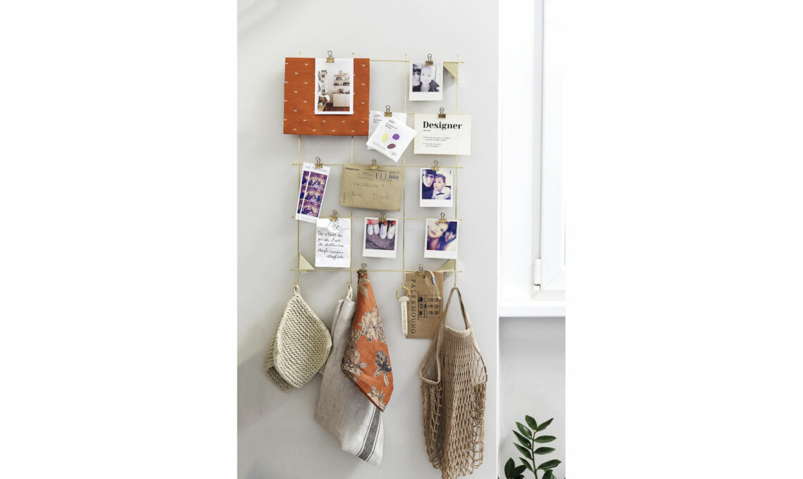 Il pannello in rete dorata appeso in cucina diventa memo per le ‘to do list’, display per le foto e i ricordi di famiglia, ma fa pureda appendino per le presine, gli strofinacci e la shopper di rete fissate alle clip. Ogni spazio è stato pensato per assolvere a una funzione precisa ed essere anche piacevole esteticamente.