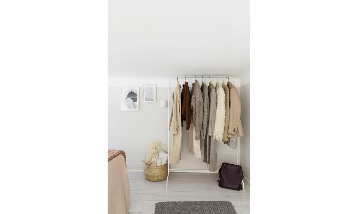 Arreda – raccontando lo stile di Roberta – lo stand appendiabiti Mulig [Ikea, cm 99x46x152h €9,95] dove si alternano i vestiti a seconda delle stagioni. Portabiti in legno di faggio [Toscanini].