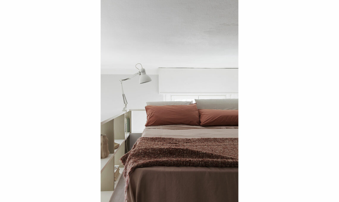 La soluzione ideale per sfruttare lo spazio? Il modulo a giorno a correre sul soppalco ha la doppia funzione di parapetto e di libreria, schermando senza chiuderla, la zona notte con il letto contenitore. Tessile letto [Society Limonta].