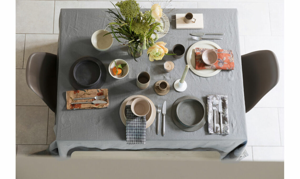 Tovaglia Bon in lino color fumo e tovaglioli in ramié stampato [Society Limonta]. Piatti, tazze, tazzine caffè e ciotole in grès della collezione Rosa Morada e Sunafè [Martina Geroni], fiori [Clori Home & Flowers].
