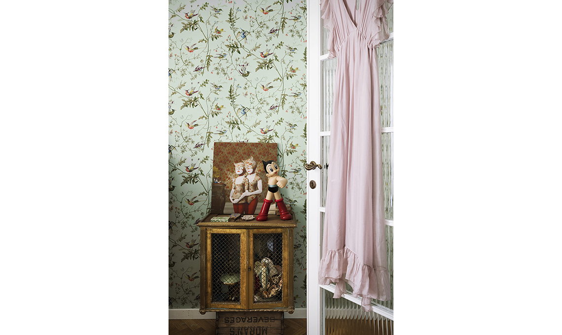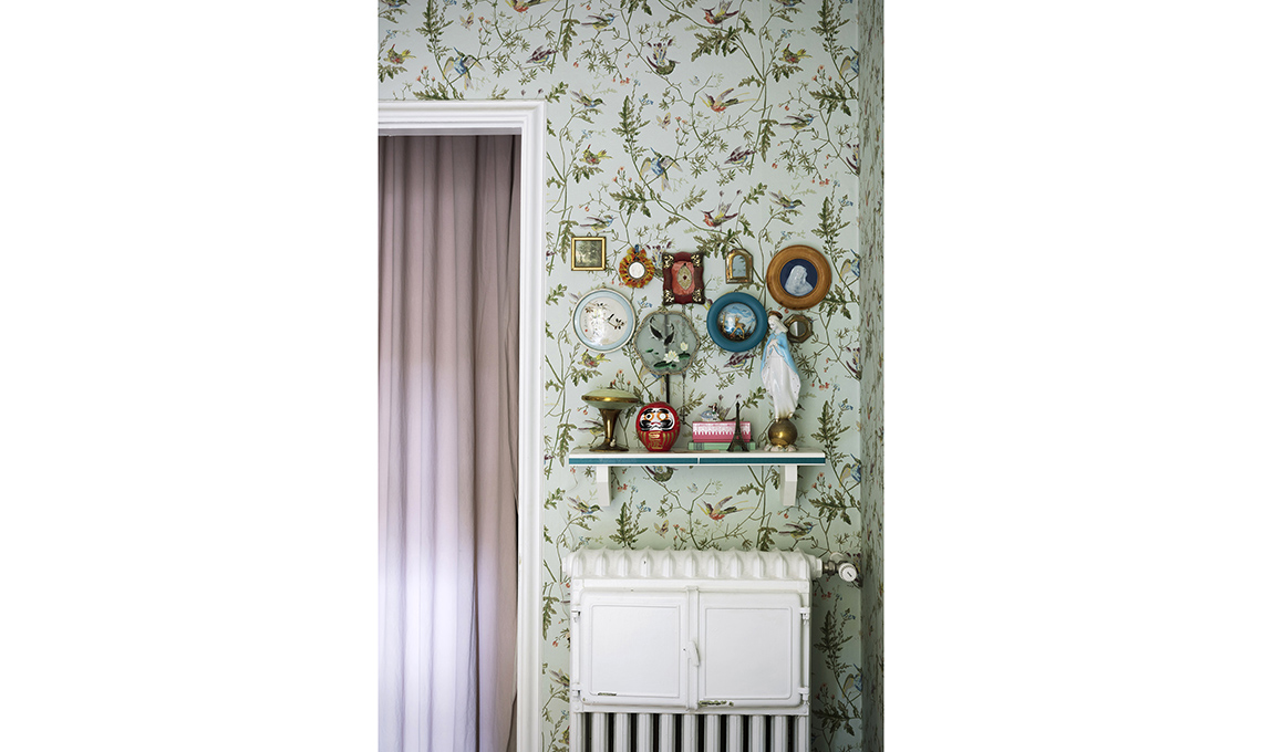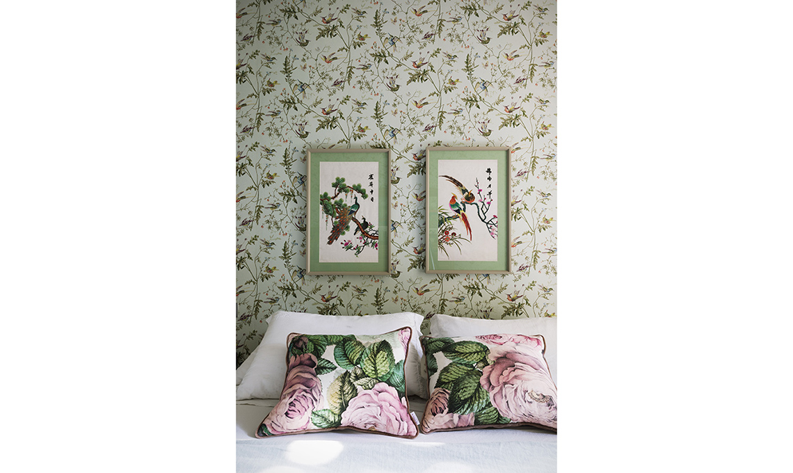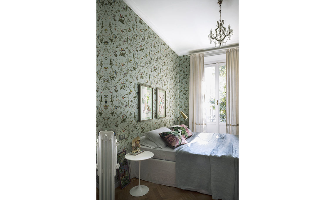 Wallpaper Hummingbirds – collezione Archive Anthology [Cole & Son, €169 il rollo da m 10x53 cm]. Due tavolini Saarinen Tulip [Knoll, ø cm 41] fanno da comodini. lampada in ottone Precise [House Doctor, da Nap Atelier].