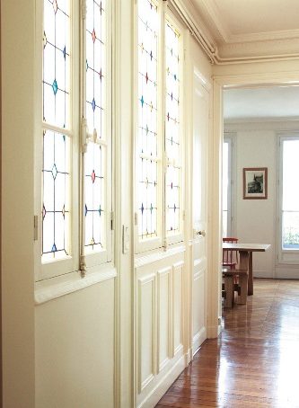 Il tavolo rustico, il parquet, gli infissi, la boiserie: l’essenza scura di quest’ultima si contrappone a quella più chiara dei primi tre e dei colori dei complementi. E dà un tocco di calore!