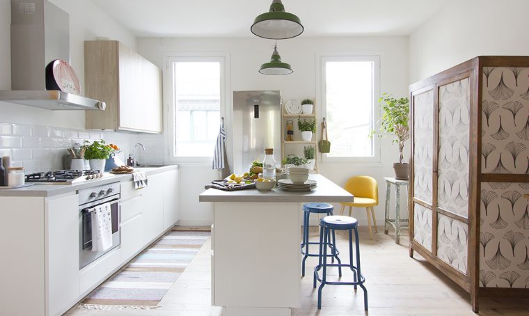 Da notare l’incasso studiato ad hoc per il grande frigorifero: le basi proseguono in un mobile a colonna che diventa, in parte, anche capiente vetrina.