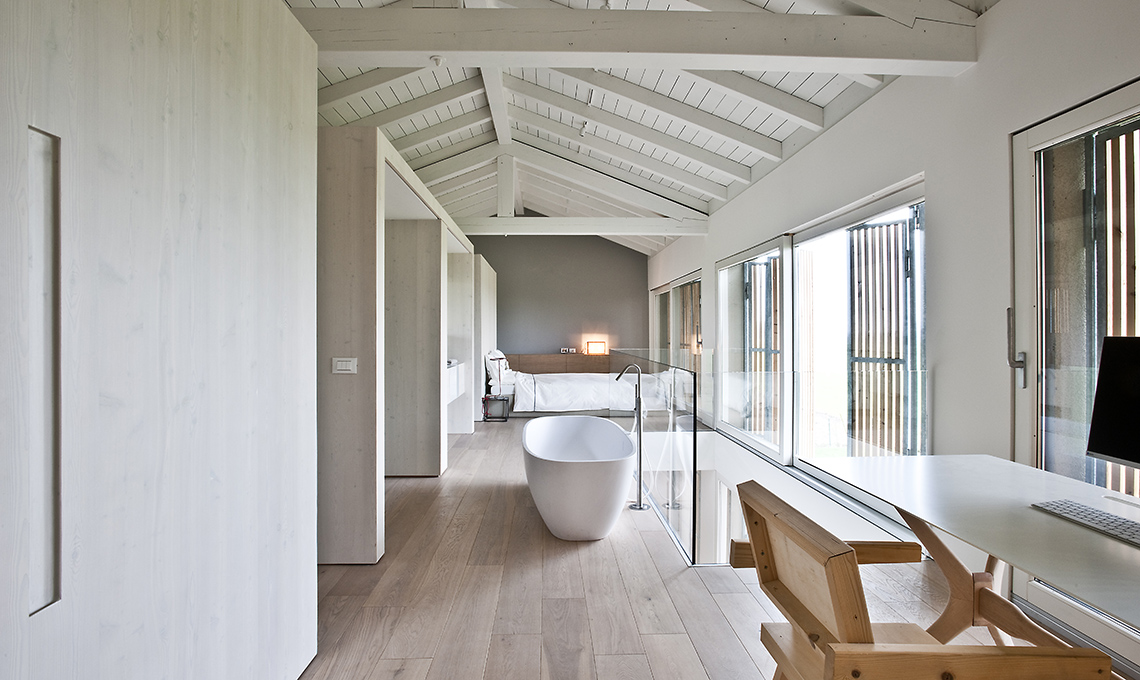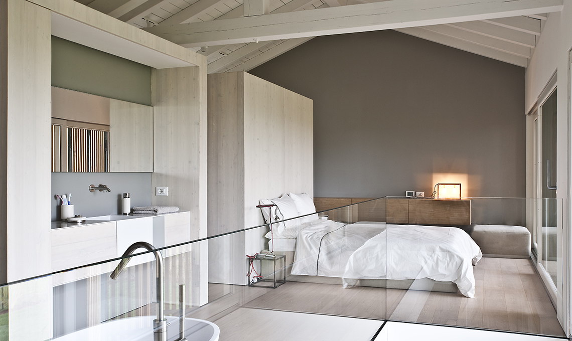 Anche il secondo livello è organizzato come un open space, impresa assai più ardua per la zona notte. Ma la geniale soluzione di racchiudere armadi, guardaroba, sgabuzzino, bagno e lavanderia in una serie di ‘scatole’ in legno ha permesso di separare gli ambienti senza bisogno di muri, anche per non intaccare la struttura a capriate della copertura.