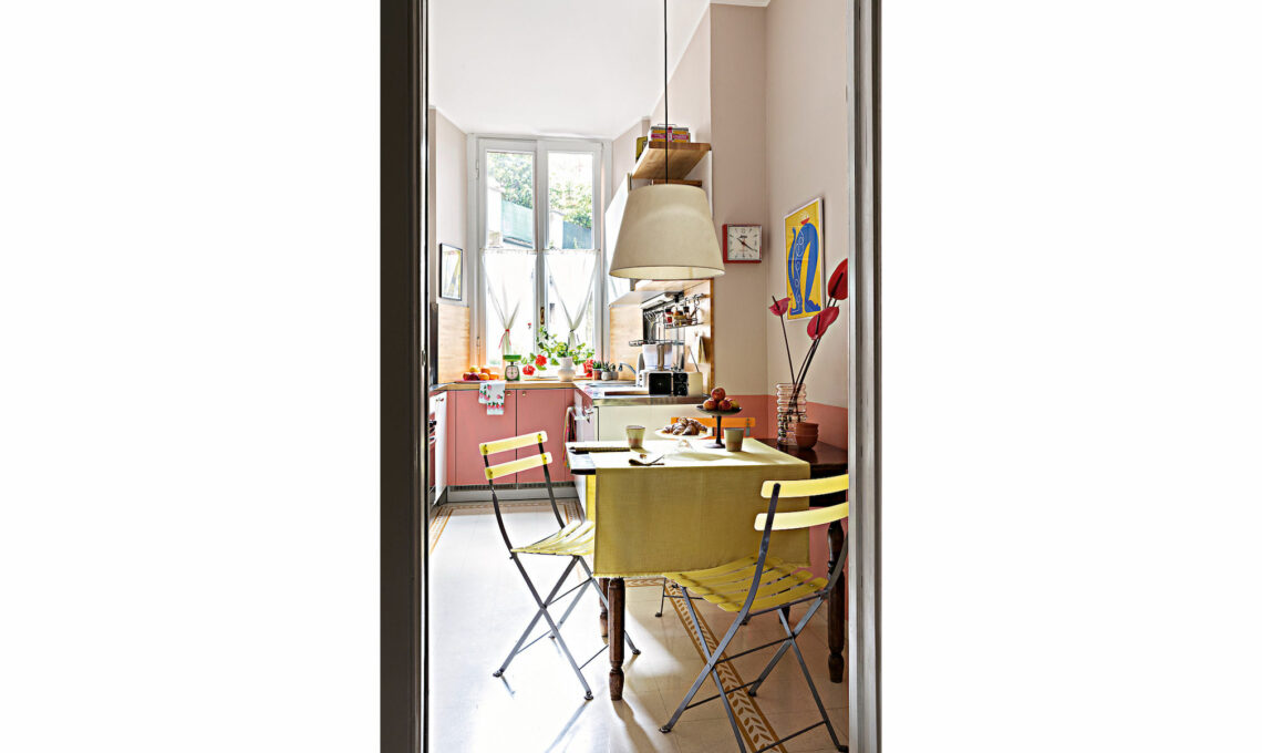 La cucina è un modello originale Dada di vent’anni fa, ancora in ottimo stato: per svecchiarla e darle personalità, Mariapaola ne ha fatto dipingere una parte delle basi con uno smalto rosa corallo (ripreso sui muri con la boiserie dipinta) e ha cambiato i pomelli.
