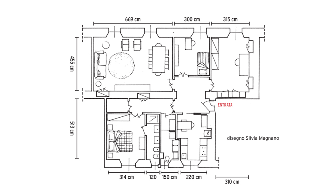 La padrona di casa è una grande ammiratrice dell’architetto Piero Portaluppi (Milano, 1888-1967) e ha voluto riprendere da lui il tema decorativo delle losanghe, che troviamo sia in soggiorno sia sulla tappezzeria dello studio.