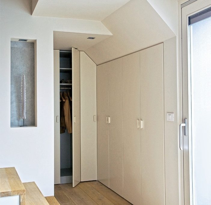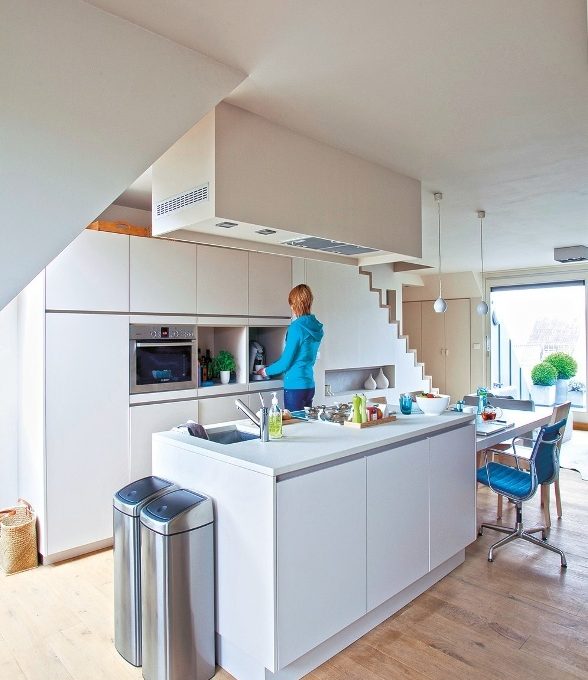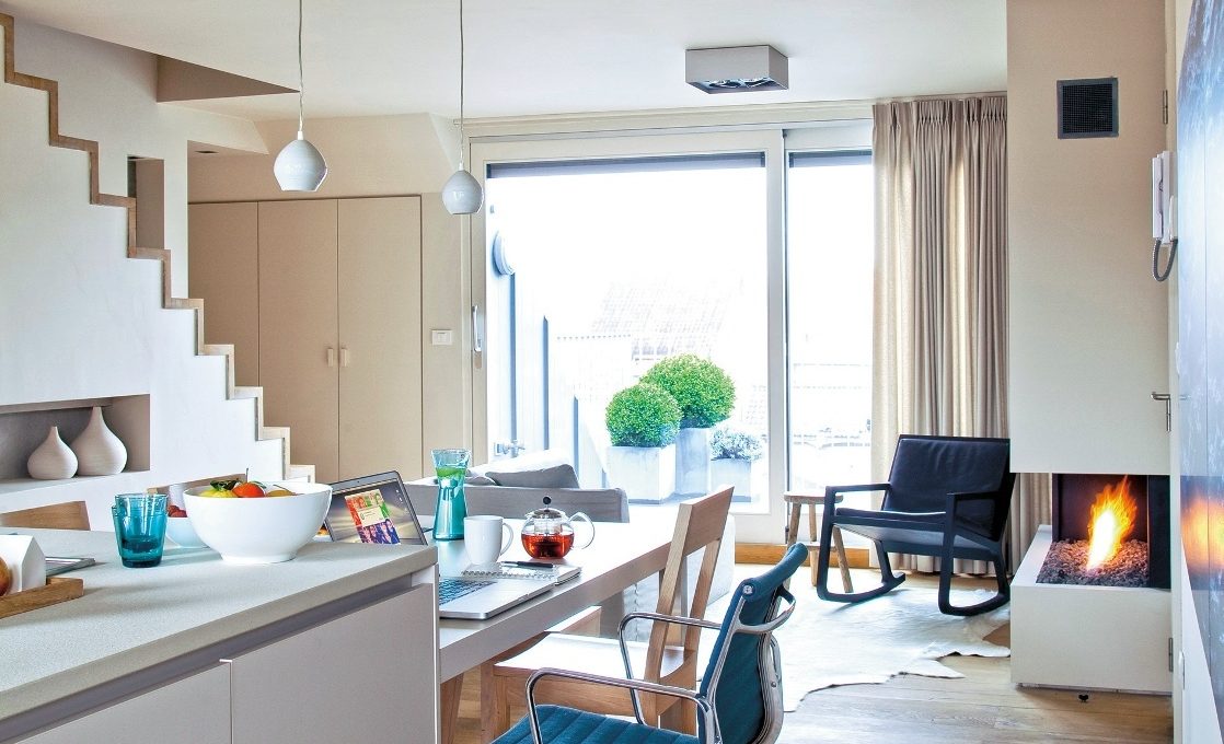 Siamo in Belgio, nelle Fiandre, in una luminosa e moderna mansarda su due livelli con uno spicchio di cielo come vista e... una giovane famiglia «che ama stare insieme, anche quando ognuno è occupato a fare cose diverse». Parola di Bieke Claessens, proprietaria di casa e ispirata fotografa d’interni, rimasta folgorata ‘dall’abbraccio’ di luce (da mattina a sera!) che l’ha investita al suo primo ingresso. Tanto da divenire l’ispirazione principale del progetto d’interni, seguito inizialmente dall’architetto Isabelle Bijvoet e portato a termine dallo studio d’architettura C’Aksent. L’intento era chiaro: realizzare un luminoso rifugio-ufficio con ambienti aperti, ma ricchi di accoglienti spazi funzionali definiti, senza ricorrere a nette separazioni. E con accorgimenti tecnici, d’arredo e strutturali, per assecondare ogni esigenza. COSÌ PUOI LAVORARE IN CUCINA Bieke ha voluto la sua postazione-ufficio in cucina...che è open, of course! Aperta sull’ingresso e fulcro della mansarda, la cucina è infatti un invito alla convivialità e alla contaminazione di funzioni. E' un ufficio domestico che rispecchia il piacere di condividere il tempo e lo spazio con i propri familiari e che si può frequentare liberamente, senza vincoli di orari, nel tipico ‘doppio gioco’ quotidiano di chi lavora da casa! Per l'home-office, annesso all’isola centrale attrezzata per la preparazione dei pasti, è stato progettato un ampio piano ribassato, con funzione di tavolo-scrivania, servito dalle prese elettriche e dalla predisposizione Ethernet (per l’accesso a Internet), necessari all’uso del computer, rigorosamente portatile!. Così nell’area cucina tutto risulta perfettamente integrato, eppure, ogni elemento e ogni spazio mantengono un proprio ruolo ben definito. IL CAMINO A GAS METANO Nell’angolo più poetico della casa, dedicato a coccole, letture e riflessioni, occupa la scena un imponente camino a gas metano che, pur regalando l’atmosfera e l’emozione del fuoco tipiche di un caminetto a legna, non comporta le operazioni di gestione e manutenzione che un focolare tradizionale richiede. Un mix di funzionalità e bellezza che, se hai a disposizione una canna fumaria, puoi adottare anche tu: la scelta è tra i modelli a metano o a GPL e tra quelli a focolare chiuso -dotati di camera stagna e connotati da rese alte quanto quelle di un impianto di riscaldamento tradizionale- o a focolare aperto che, più che produrre calore, riscaldano l’atmosfera creando intimità attorno alle fiamme vive. Entrambe le tipologie sono garantite da norme di sicurezza. IL TERRAZZO A TASCA NEL TETTO Ad accogliere la pioggia di luce che entra copiosa e a lasciare fuori il caldo e il freddo eccessivi ci pensa un’ampia e iper-isolata portafinestra scorrevole a due ante. Dalla quale si accede all’orgoglio di casa, un delizioso terrazzo ‘a tasca’ ricavato nella falda del tetto. Una soluzione suggestiva che, nei condomìni italiani, è possibile se non vi sono vincoli architettonici e da regolamento condominiale e, secondo una sentenza della Cassazione del 3/8/2012, se la modifica ‘non significativa’ al tetto ne mantiene al 100% la sicurezza statica e la funzione di copertura e protezione. ARMADI NELLE PARETI PERIMETRALI Una delle esigenze familiari era quella di ricavare più armadiature a muro possibili. Anche sfruttando la profondità delle pareti perimetrali, nonostante fossero contrassegnate da tagli strutturali e altezze diversi dovuti alla particolare copertura a pendenza multipla (tipica di molte mansarde del Belgio). Un ostacolo superato realizzando gli armadi su misura, cosa peraltro comune in un sottotetto. Quello che di atipico è stato fatto, invece, riguarda l’attrezzatura interna: una struttura flessibile e modulare che Bieke, all’occorrenza, un domani potrà smontare e adattare ad armadi a muro diversi. SCALA IN PARQUET E NICCHIE Progettate volutamente come un gioco di tagli grafici, le nicchie rivestite e il profilo zigzagante in legno della scala in muratura fanno coppia scenica, rendendo ancora più dinamico lo spazio. Un gioco ottico ben riuscito grazie anche alla presenza continua del parquet e alla progettazione della scala rettilinea a una rampa (senza bisogno di pianerottolo in quanto la differenza tra i due livelli da collegare non superava in altezza 250 cm). Il tutto facilmente riproponibile anche a casa tua: al posto del parquet, puoi anche optare per i maxi-listoni in laminato, facilissimi da posare. E per dare maggiore matericità al rivestimento delle nicchie, puoi scegliere la ceramica a effetto pietra. LUCE BASSA PER LA TV Luci in sala!, verrebbe da dire... già perché l’invidiabile luminosità di questo mini-living con due finestre diventa (quasi) un difetto nel momento in cui, acceso il televisore, provoca un fastidioso riverbero. Un problema risolto con delle tendine fisse antiriflesso nella parte bassa dei serramenti e con una tenda a rullo schermante, dotata di un tessuto completamente oscurante, per... l’effetto cinema! PER DORMIRE IN MODO SANO  Bieke ci tiene a dormire bene e segue regole della filosofia asiatica. Prima tra tutte l'orientamento della testiera del letto a Nord, affinché la testa - polo positivo del corpo - risulti corrispondente al polo negativo della terra. Si ottiene così un buon riequilibrio magnetico ed energetico, che agevola le funzioni vitali. Per chi non può posizionare così il letto, si consiglia verso Nord-Est (mai Sud o Ovest). In più, nella stanza da letto, che a breve sarà destinata alla piccola di casa, tutto è 100% green. A cominciare dal letto in legno di faggio massello, realizzato artigianalmente, trattato con olio di lino e assemblato esclusivamente a incastro (senza alcuna parte in metallo). Come base, delle doghe in massello di faggio evaporato e curvato a caldo, inserite nel telaio tramite vitoni in legno. La tipica atmosfera pacata, soffusa e un po’ austera delle spa, che Bieke vole