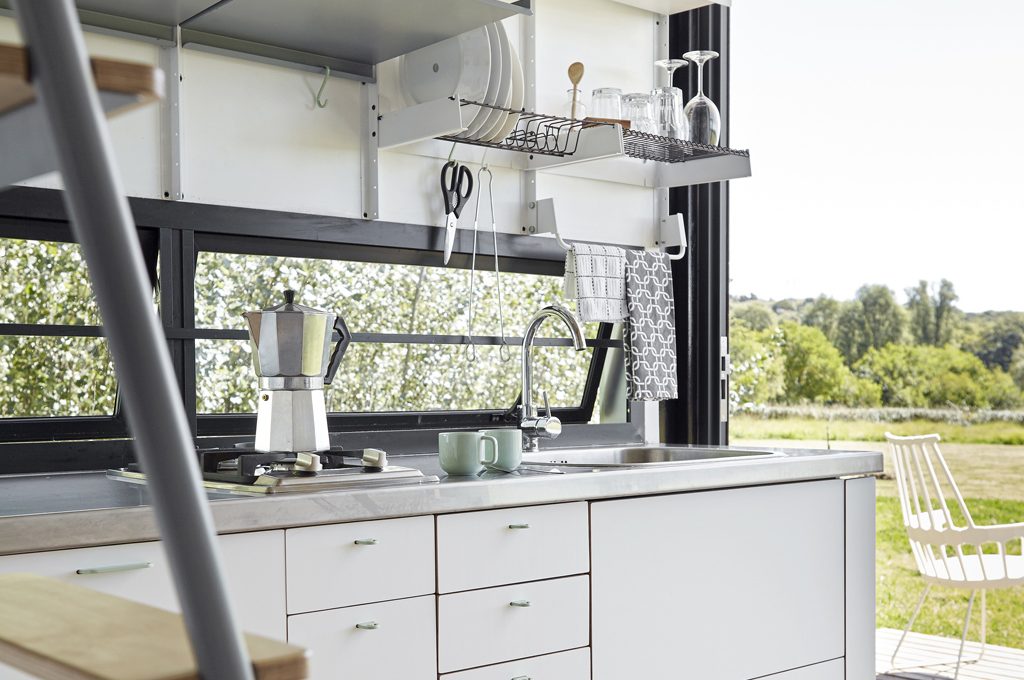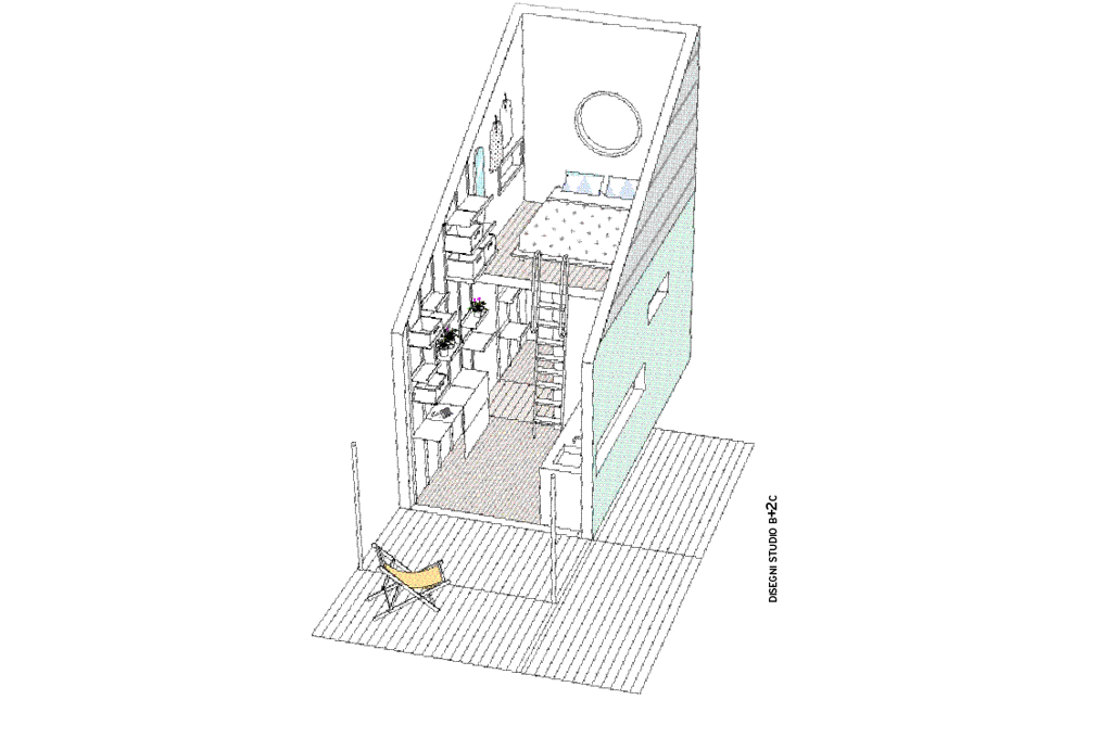 La minicasa si sviluppa su due livelli. Sul soppalco si trova il letto, davanti alla cucina invece è presente il tavolo da pranzo pieghevole. Il sistema di cremagliere è il vero cardine del progetto, unico elemento fisso. Tutti gli arredi sono disegnati dallo studio Dokter and Misses.