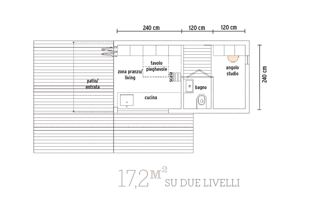 Per far entrare tutte le necessità di una vera casa in 17,2 metri quadrati è necessario che ogni spazio, anche minimo, sia organizzato per svolgere funzioni diverse: così, ad esempio, il corridoio di ingresso è in realtà la cucina.