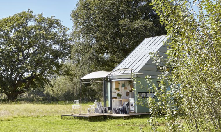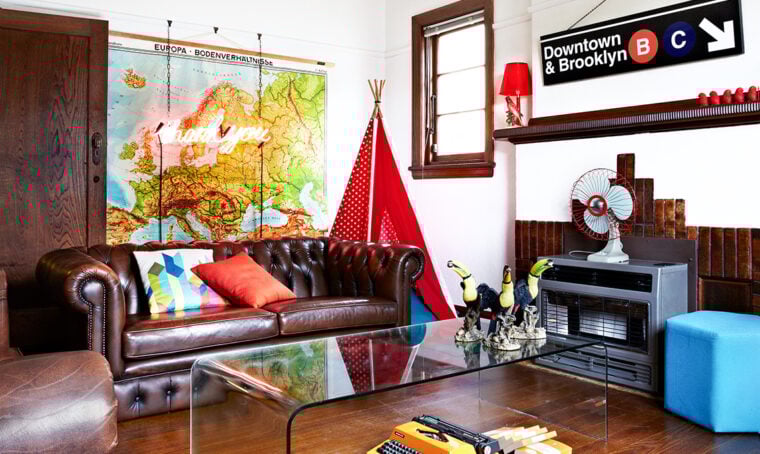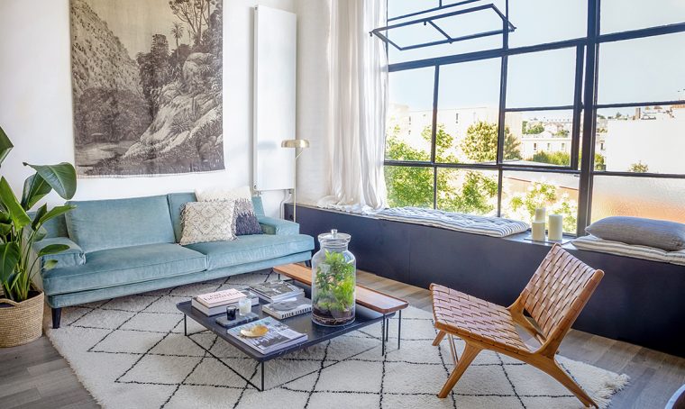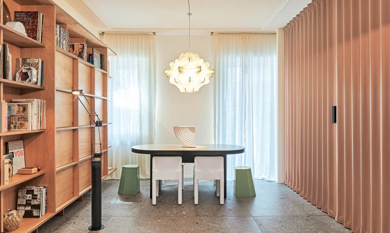 Luce [Piccola Bottega € 590], sul tavolino biglietto [Corraini], portacandela [Enzo De Gasperi] come le decorazioni verdi. poltrone Coco rosa e petrolio [Calligaris € 644], cuscino [L’Opificio].