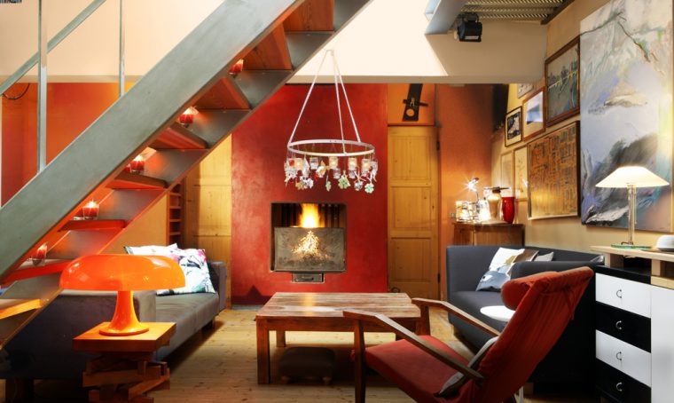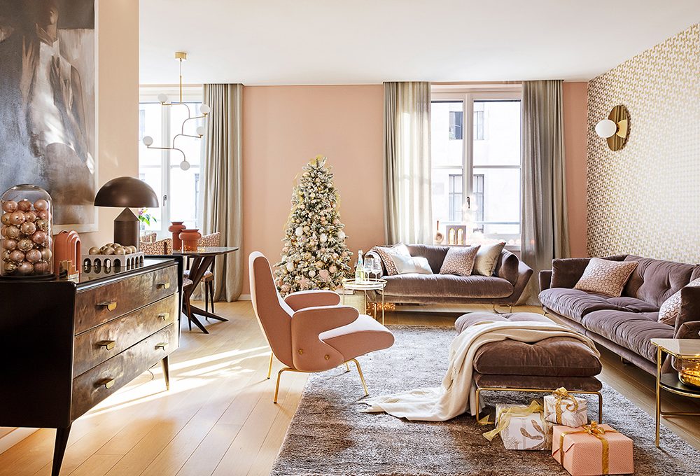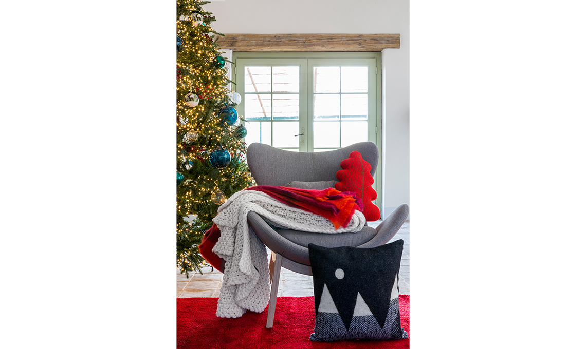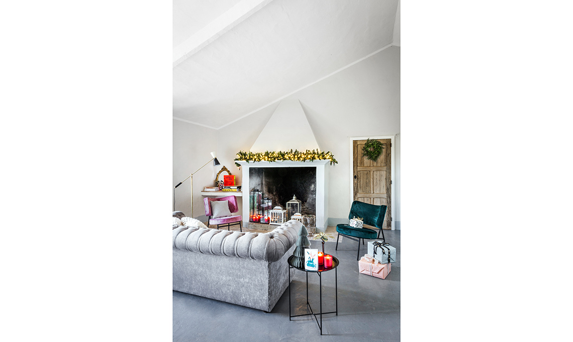 Poltrona St. Tropez [Ditre Italia € 1098]. Sulle sedute, cuscini Carré [L’Opificio da € 76] più Koyo [€ 95,32] e Lino Woven [€51] di [Donna Wilson]. Sul camino, decorazioni [Copihue Floral Studio], ceste [Forma&Memoria]; decorazioni, luci, lanterne e candele [Enzo De Gasperi], latta da collezione Alice Valenti con dolcetti [Di Stefano € 37], cappelliera rossa con panettone Excellence [Vergani € 50].