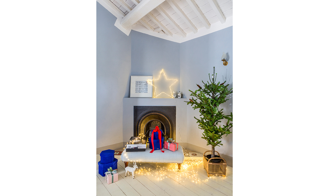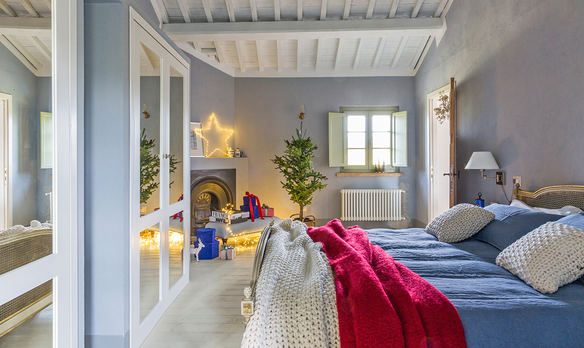 Il camino in camera è un altro pretesto per ricreare dei giochi di luci scintillanti come cristalli di ghiaccio; e la panchetta vestita è il palcoscenico perfetto per i regali più intimi, da scartare la notte di Natale.