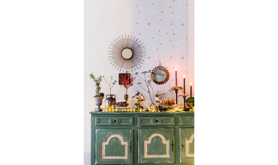 Decorazioni floreali, alzatine e oggetti in argento [Copihue Floral Studio], dolci Sweets Design [Design Food House]; uccelli [da €33], campane [€7,50], portacandele [€34] e luci [tutto Enzo De Gasperi]. A parete, specchi Eclat e Soleil [Chehoma entrambi da Galleria Mia da € 60].