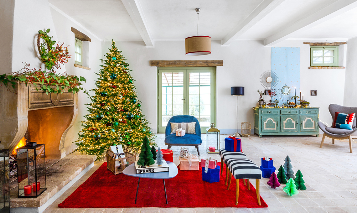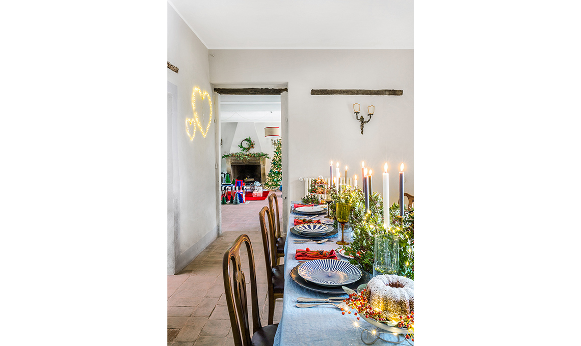 A Todi, nel casale allestito a festa, scopri come reinterpretare il rosso della tradizione: dai tocchi blu alla tavola a tema 'circus' con tante idee regalo sparse per le stanze.