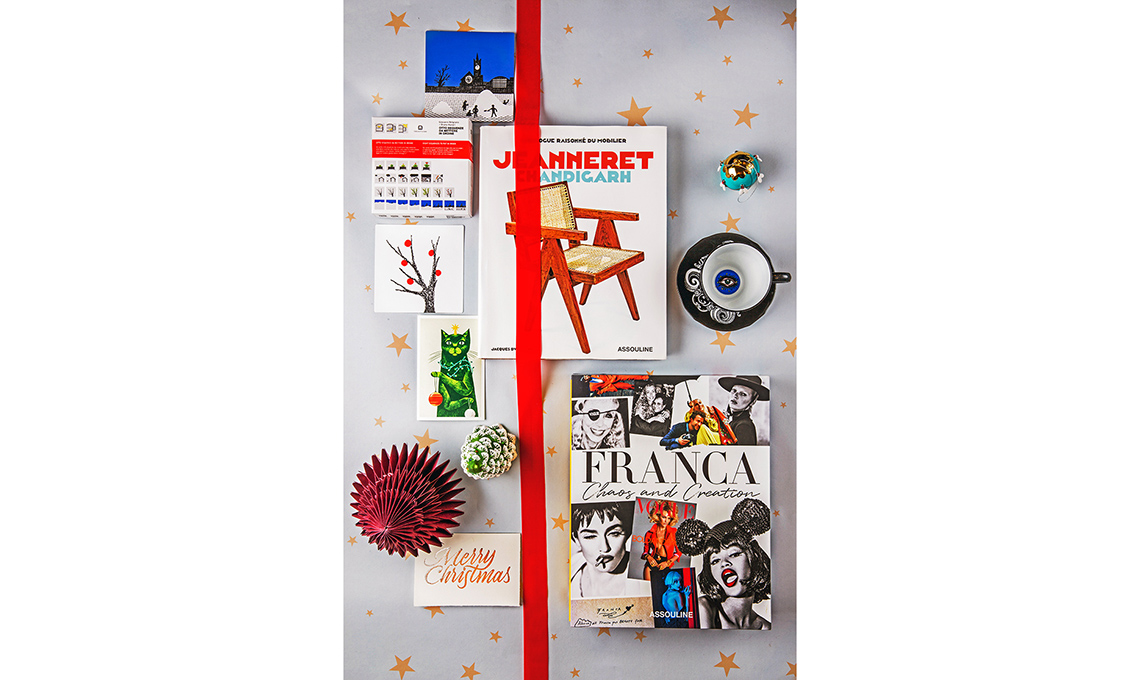 Grafiche di Bruno Munari e Giovanni Belgrano e biglietto [Corraini], alberi in carta e vetro [&Klevering € 12,90 e € 9,95], biglietto Merry Christmas [Fabriano Boutique], libri ‘Jeanneret Chandigarh e Franca - Chaos and Creation’ [Assouline €195 e €250], palla Ape dell’Oro [Alessi € 35], wallpaper Stelle Dorate [Murals Wallpaper € 37,20 il mq].