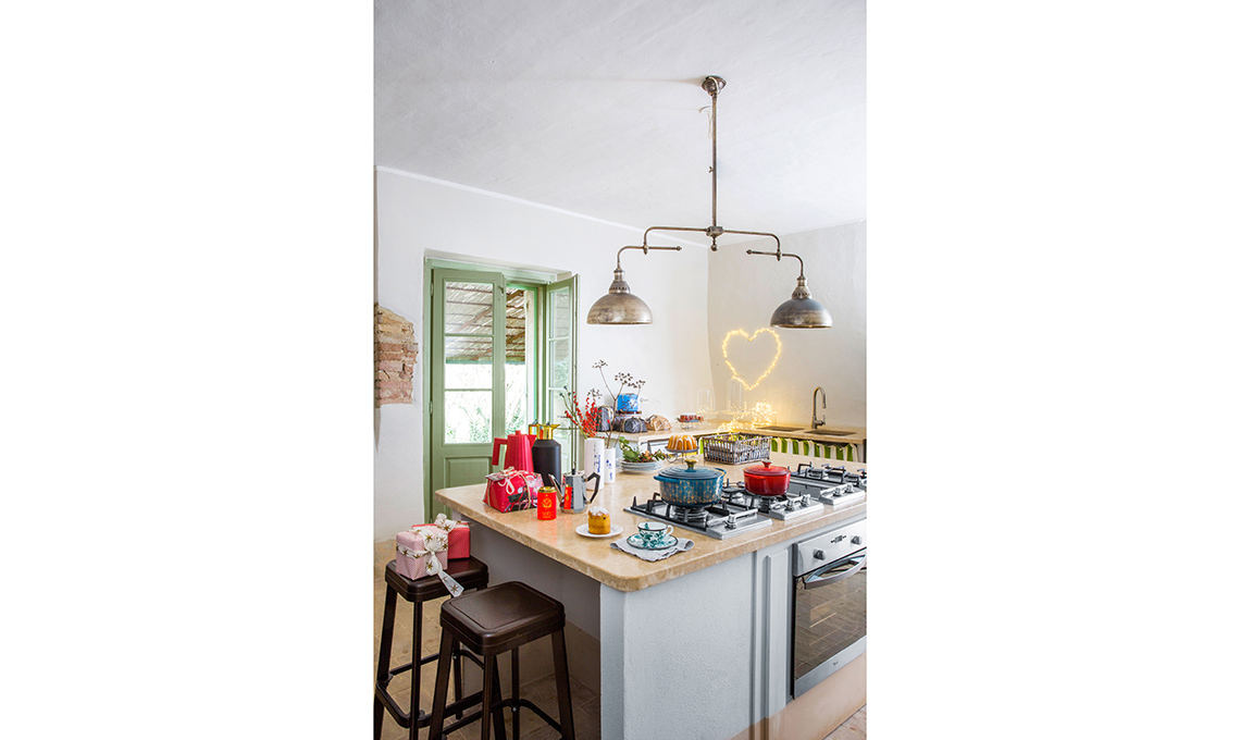 L’impianto rustico del casale, con le sue pianelle in cotto e gli infissi color verde Provenza, ha subito suggerito l’idea di una festa tradizionale, vivacizzata da inattese macchie di colore.
