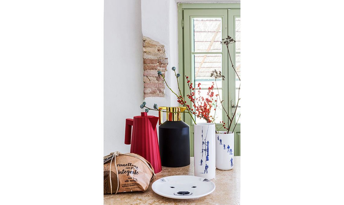 Panettone integrale [Galup], bollitore Plissé [Alessi € 89] e thermos [Normann Copenhagen €93,75], vasi Première Étoile e piatto con orso [Faïencerie Georges da € 75].