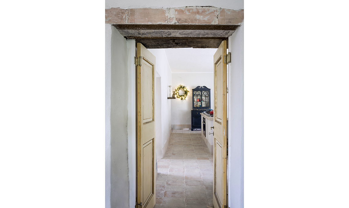 Le porte del casale per un attimo incorniciano il salotto, bello come un quadro. Il segreto di un allestimento riuscito sta nel ritmo e nell’armonia: guarda l’insieme, non solo il dettaglio.