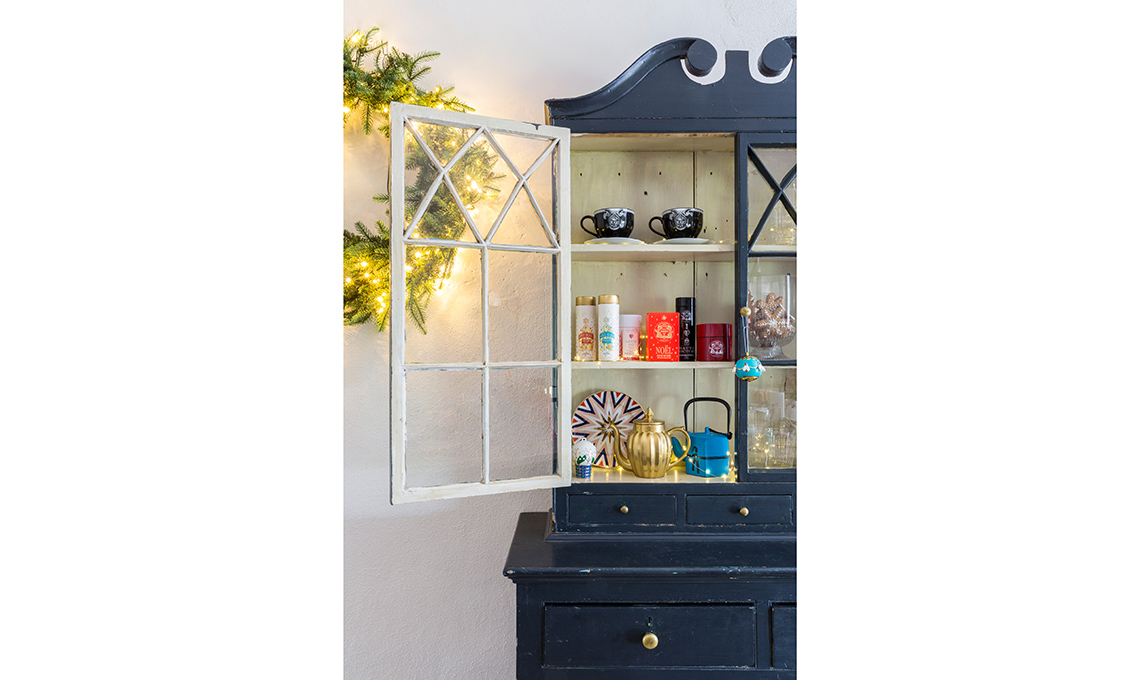 Nella vetrina, dall’alto: tazze e piattini Star Eye [Gucci Décor], tè [Mariage Frères da € 25], vaso biscotti [Bitossi Home €44], decori Mughetti e Smeraldi [Alessi€30], piatto Abracadabra Folgore [Bitossi Home €29], teiere Lucky Star oro e Gouverneur turchese [Mariage Frères €580 e €210].
